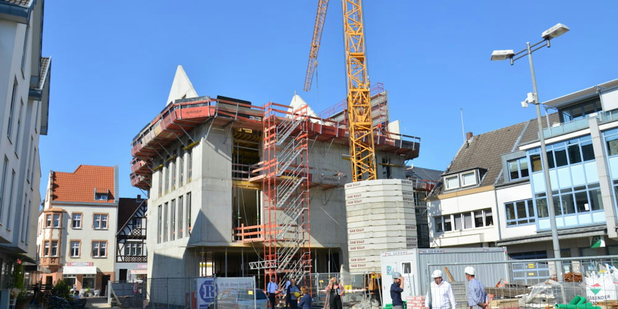 In einem Jahr sollen Neubau und der angrenzende Altbau bezugsfertig sein. Bald beginnt der Innenausbau, und die Fassade wird mit sandgrauen Ziegelsteinen versehen. Diese werden auch auf Dachschrägen angebracht. „Das unterstreicht die monolithische Wirkung des Gebäudes“, sagt Architekt Jaspert über den Bau, der das Gesicht der Innenstadt prägen wird.