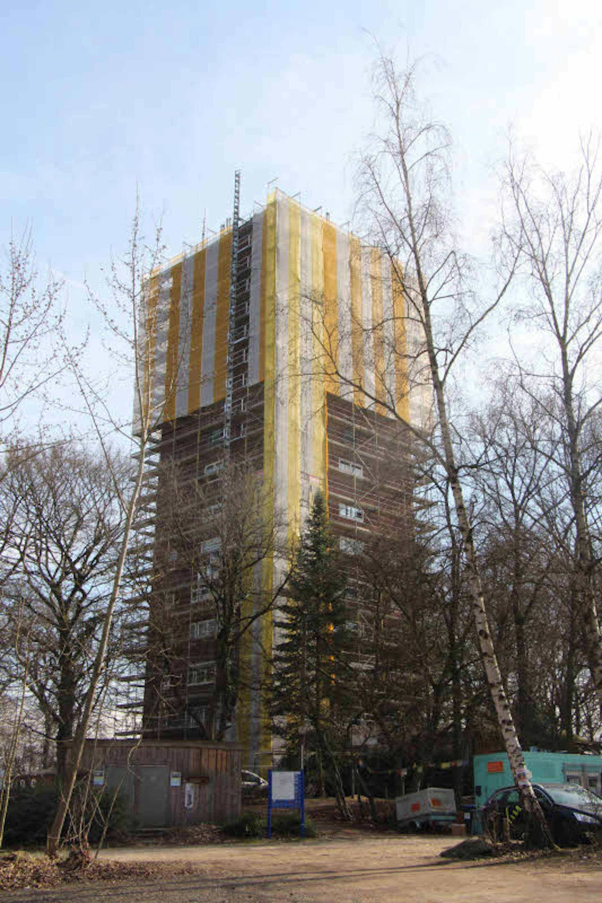 Zunächst sollte lediglich ein Teil der Außenfassade an der Nordwestseite des Turms saniert werden. Allerdings musste beim Bau in den 50er Jahren gespart werden, so dass die Stadtwerke Brühl schnell feststellten, dass an dem Wasserturm einiges mehr getan werden muss. Das Klinkermauerwerk hat über die Jahre stärker gelitten, als erwartet. Also fiel schnell die Entscheidung: Der Turm musste ganz eingerüstet werden.