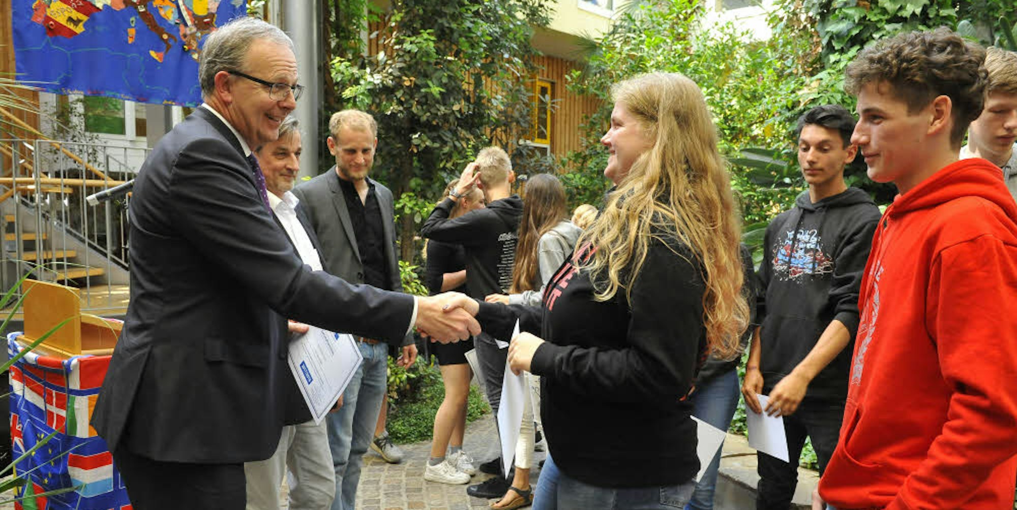 Zur Abschlussfeier des zehnten Jahrganges überbrachte der Europaparlamentarier Axel Voss die Zertifizierungsurkunde und zeichnete 20 Schüler des Jahrganges als Juniorbotschafter aus. „Darauf sind wir sehr stolz, darauf haben wir zielstrebig hingearbeitet“, sagte Schulleiterin Renate Jaus. Die Jahrgangsstufe habe maßgeblich an der Erarbeitung des Konzeptes für die Zertifizierung der Gesamtschule gearbeitet.