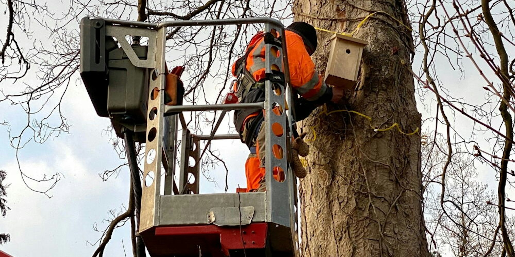 Am Dienstagnachmittag wurde symbolisch ein erstes Vogelhaus an einem Baum auf dem Südfriedhof angebracht. Eigens dafür rückte ein Kran an. In einigen Metern Höhe wurde die Nisthilfe mit einem Schlauch am Baum befestigt, um die Rinde nicht zu verletzten. „Die anderen Häuschen werden wir nicht ganz so weit oben anbringen, damit wir sie einmal im Jahr gut säubern können“, sagt Wilbert Spitz von der Brühler Ortsgruppe des Naturschutzbundes (Nabu).