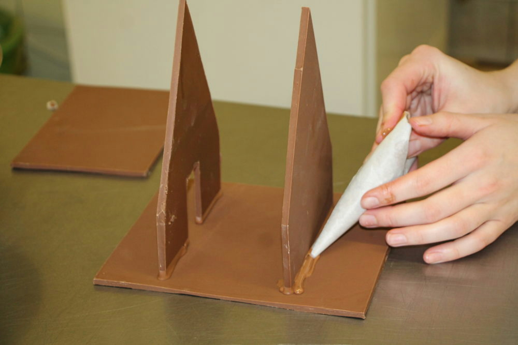 Zunächst müssen die einzelnen Teile zusammengesetzt werden. „Das mache ich mit Kuvertüre“, erklärt sie. Das Geheimnis der Verarbeitung liege in der Temperatur der Schokolade. Sie dürfe weder zu heiß, noch zu kühl sein. „Nur wenn die Kuvertüre genau die richtige Temperatur hat, wird sie auch schnell fest“, erklärt sie. Ganz genau möchte sie die Rezeptur zwar nicht preisgeben. „Aber heißer als 30 Grad sollte die Schokolade jedoch nicht sein“, verrät sie.