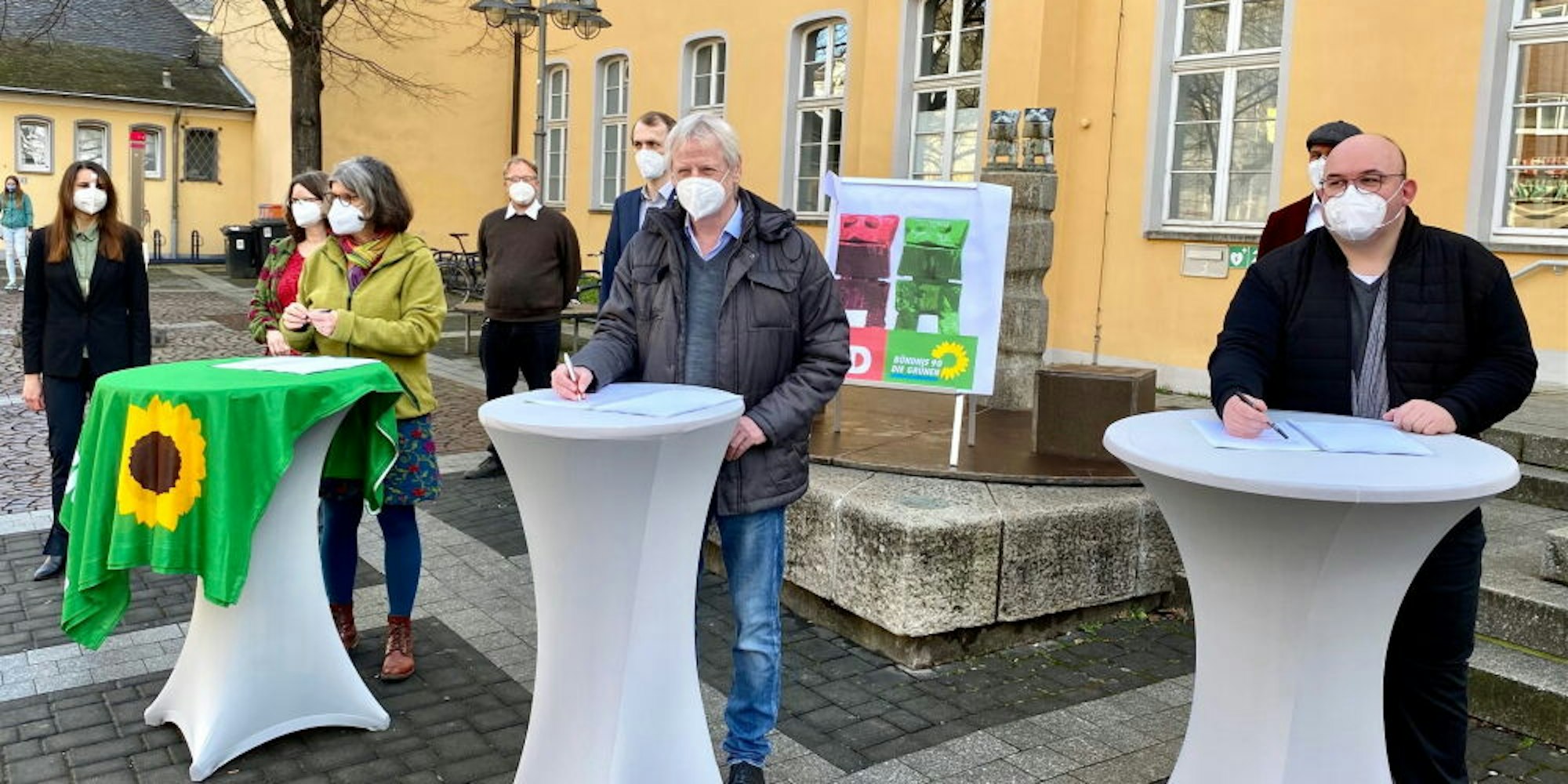 Brühl – Freudige Gesichter hinter ihren Masken gab es am Samstagvormittag bei den Mitgliedern der Grünen und der SPD in der Innenstadt. Öffentlichkeitswirksam haben die Fraktions- und Parteispitzen der beiden Brühler Parteien sowie Bürgermeister Dieter Freytag (SPD) ihren Kooperationsvertrag für die gemeinsame politische Arbeit in den nächsten fünf Jahren unterzeichnet. Dafür wurden kurzerhand vor dem Rathaus drei Stehtische und Parteibanner aufgestellt. Zudem leuchtet von nun an ein roter und ein grüner Frosch, nachgeahmt den kunstvollen Tierfiguren am Max-Ernst-Brunnen neben dem Rathauseingang, gemeinsam von einem Plakat.