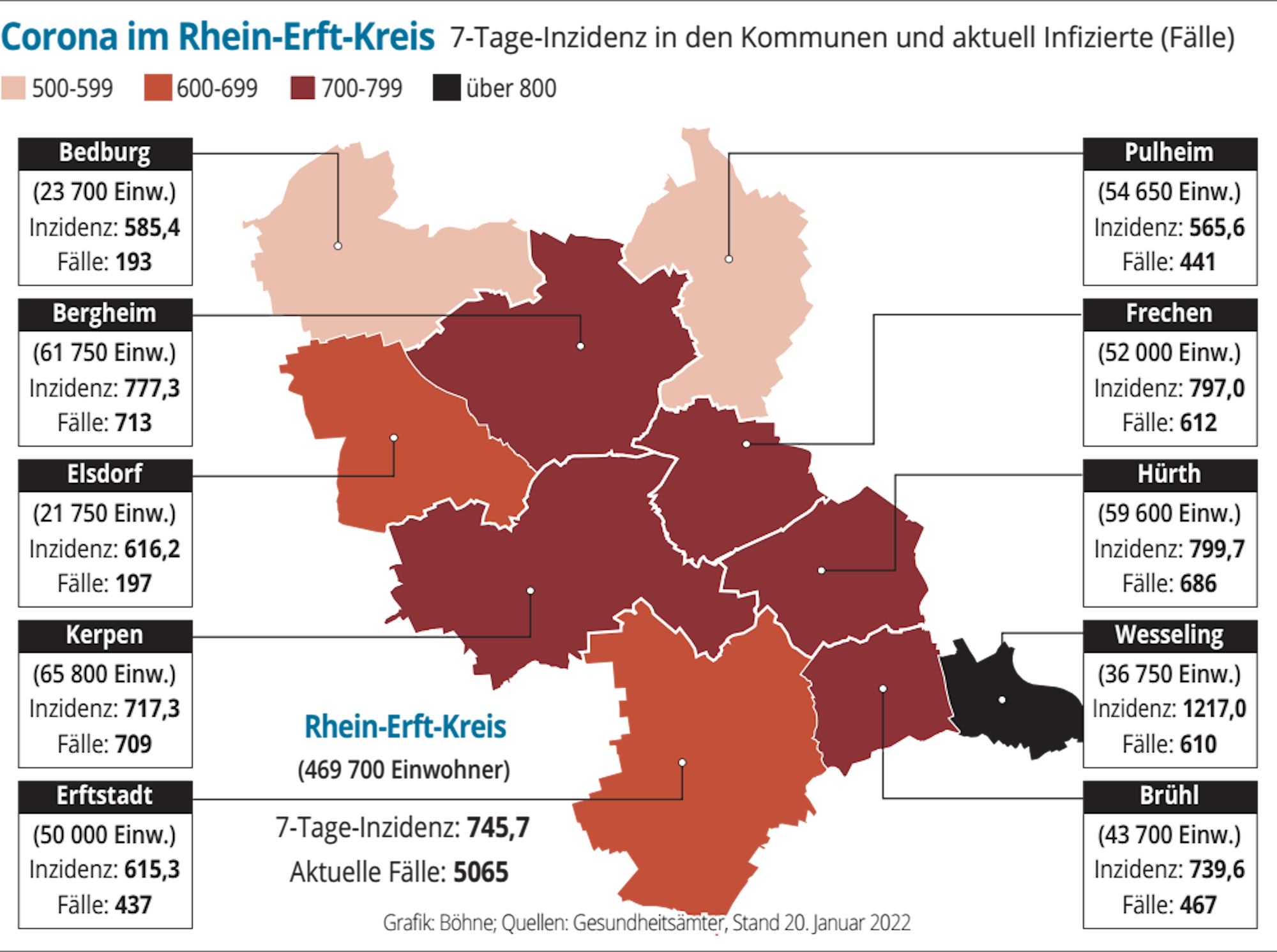 Auch der Inzidenzwert ist auf einer Rekordhöhe. Zum genannten Zeitpunkt lag er kreisweit bei 745,7. In Wesseling hat er am Mittwoch erstmals in einer Stadt im Rhein-Erft-Kreis die Marke von 1000 übersprungen – am Donnerstag um 14 Uhr lag dort die Zahl der Neuinfektionen je 100.000 Einwohner in den vergangenen sieben Tagen schon bei 1217,0. Dahinter folgt Hürth mit 799,7. Die niedrigste Inzidenz hat Pulheim mit 565,6.