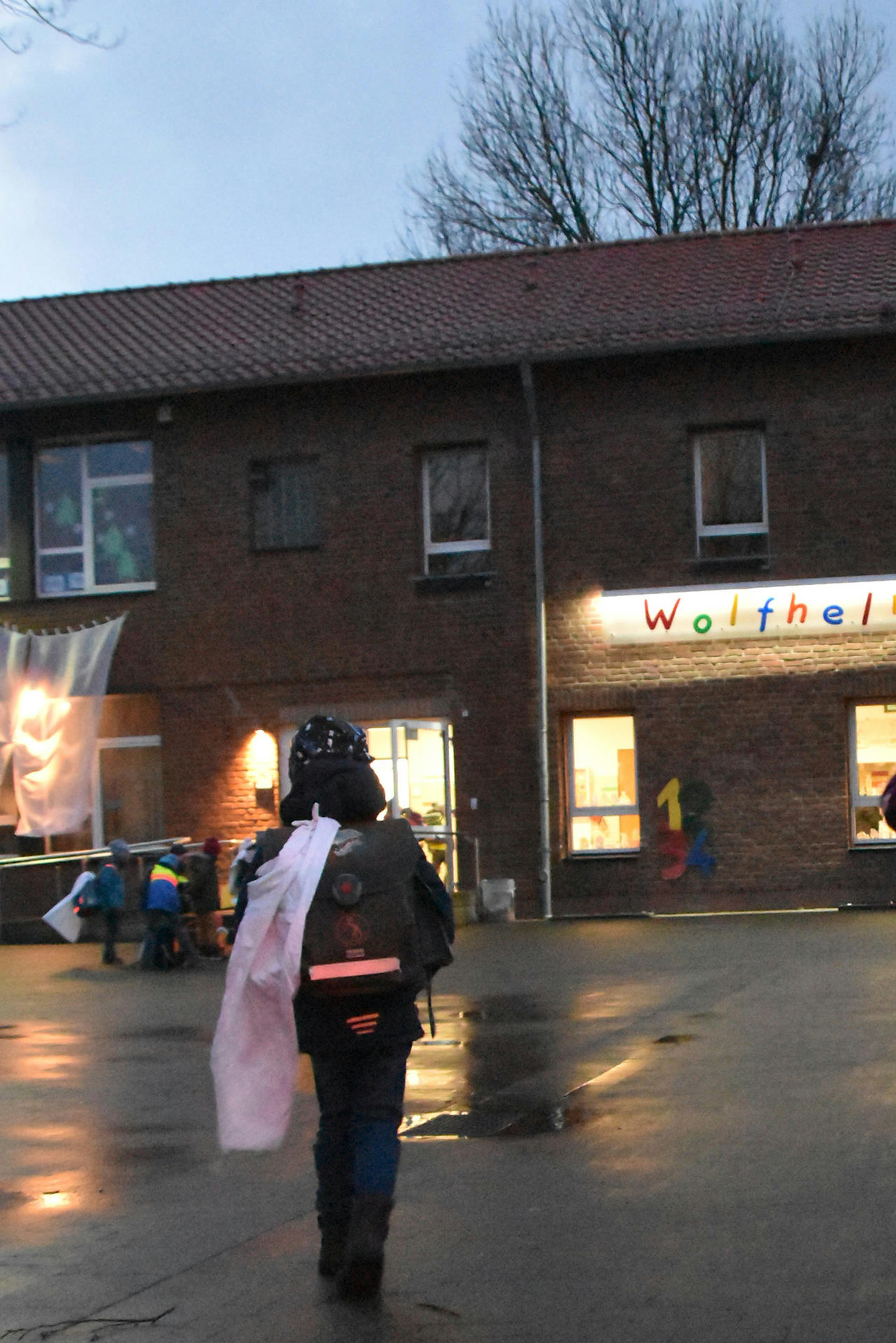 Mit weißen Tüchern am Schulranzen kamen die Kinder in die Wolfhelmschule in Pulheim-Dansweiler.