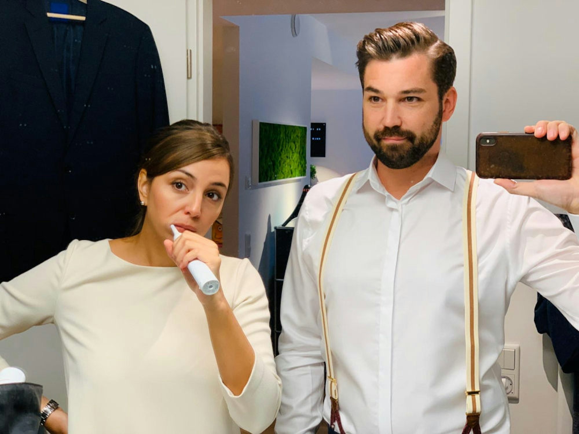 Um das Outfit haben sie sich trotzdem viele Gedanken gemacht. „Wir haben immer wieder Outfits anprobiert und Selfies gemacht“, erzählen die beiden. Zum Schluss wurde es eine Mischung aus leger und festlich: Oben gekleidet mit Hemd und Fliege, saßen die Eltern in Jeans und Hausschuhen auf dem Sofa und schickten ihre Grüße aus dem Wohnzimmer. Das Kölner Brautpaar war so gerührt, dass es als Dankeschön auf die Schnelle ein Hochzeitsvideo von einer Hochzeit produzierte, die nicht stattgefunden hat.