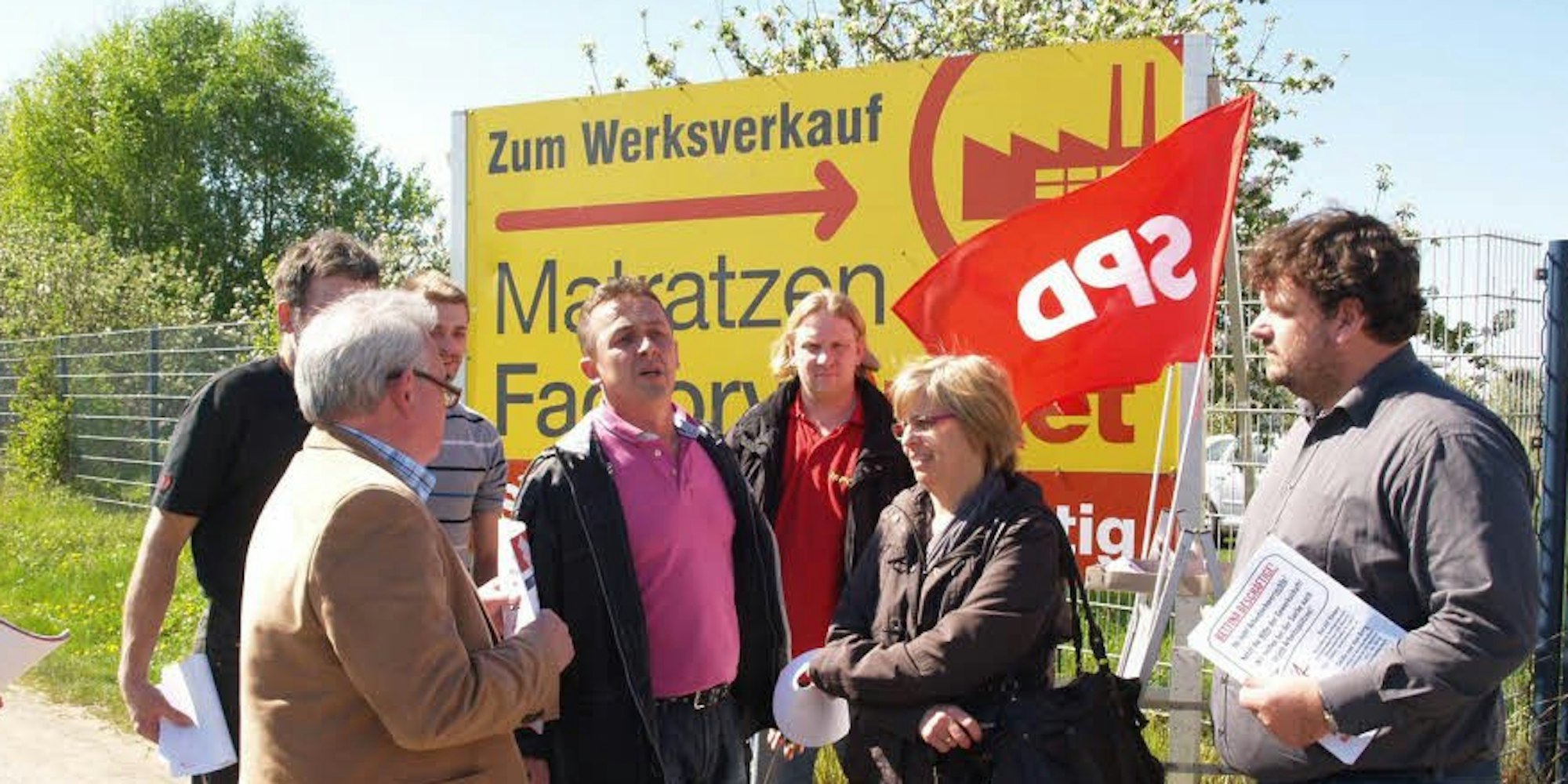 Die Mitarbeiter von Bettina Matratzen wurden vor dem Firmeneingang von Vertretern der SPD informiert und bekamen Hilfe angeboten.