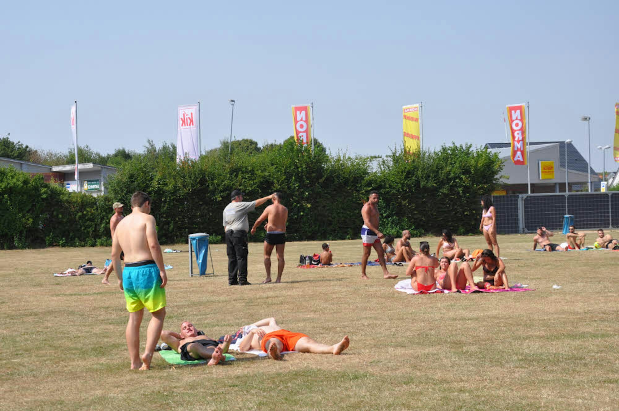 Unterstützung für einen reibungslosen Badebetrieb leistet auch die Security vom Elsdorfer Wachdienst Angelguard. Seit drei Jahren sind an heißen Tagen zwei bis vier Sicherheitskräfte auf den Wiesen unterwegs. Gerade muss eine Gruppe Barfußkicker ermahnt werden. Nach kurzem Gespräch gehen Securitymitarbeiter Hans Schmitz und die Fußballfreunde freundlich auseinander, der Kick wird in eine Ecke verlegt, in der der Ball nicht bei anderen Badegästen einschlagen kann.