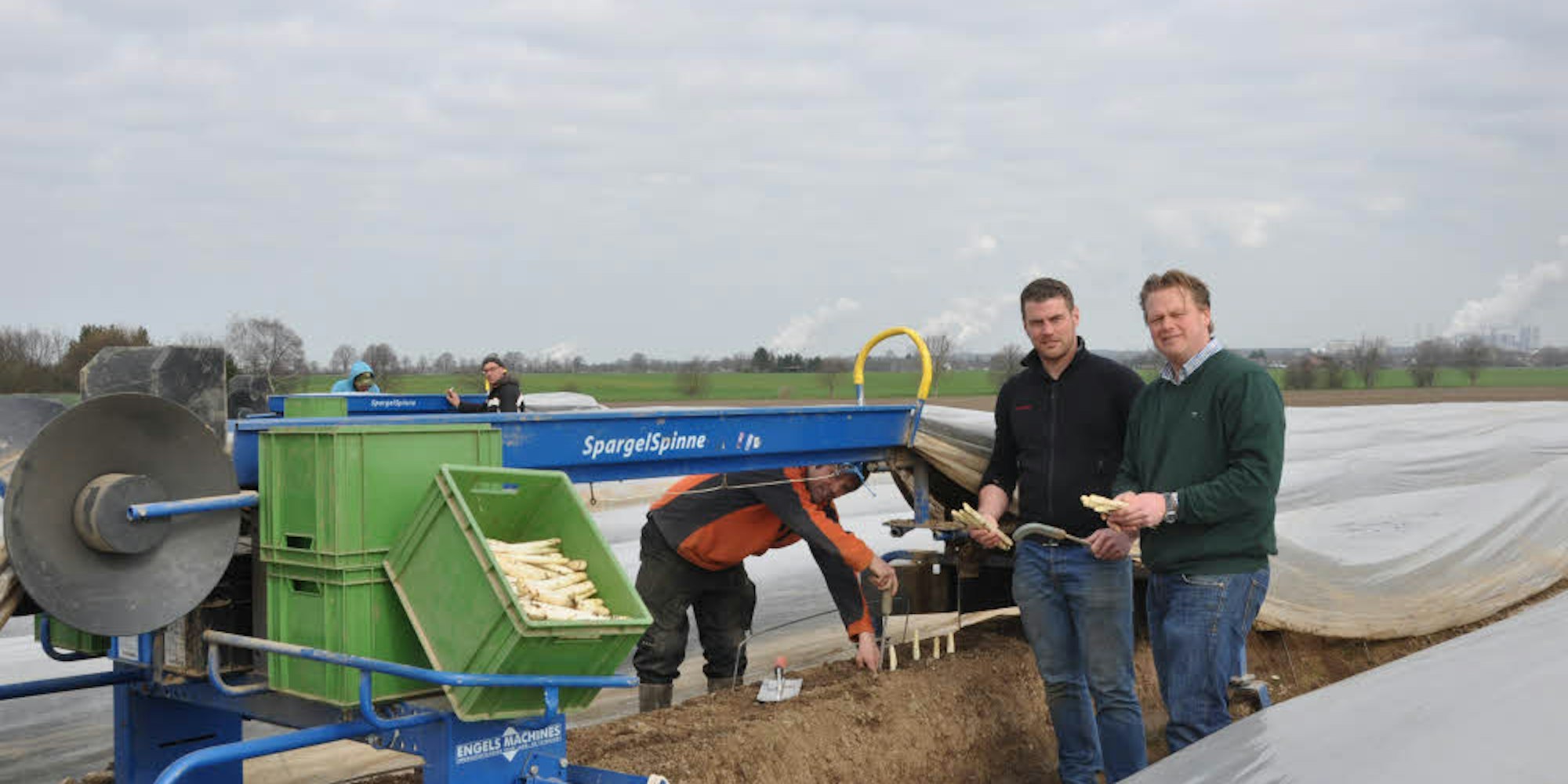 Über den Start der Spargelernte auf den von Tagebausümpfungswasser beheizten Feldern freuen sich Johannes Nagelschmitz und Roman Sauer (v. r.).