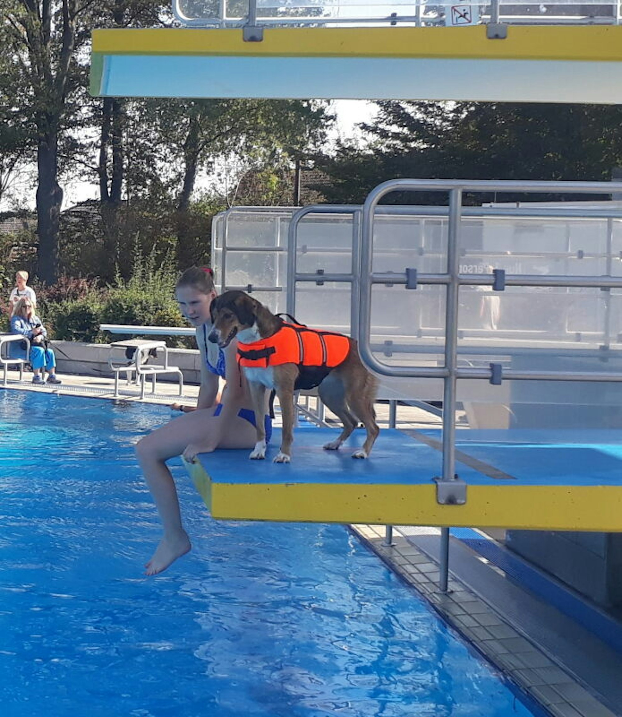Noch ist der Hündin Biene die Höhe nicht ganz geheuer. Doch schließlich springt sie doch ins kühle Nass.