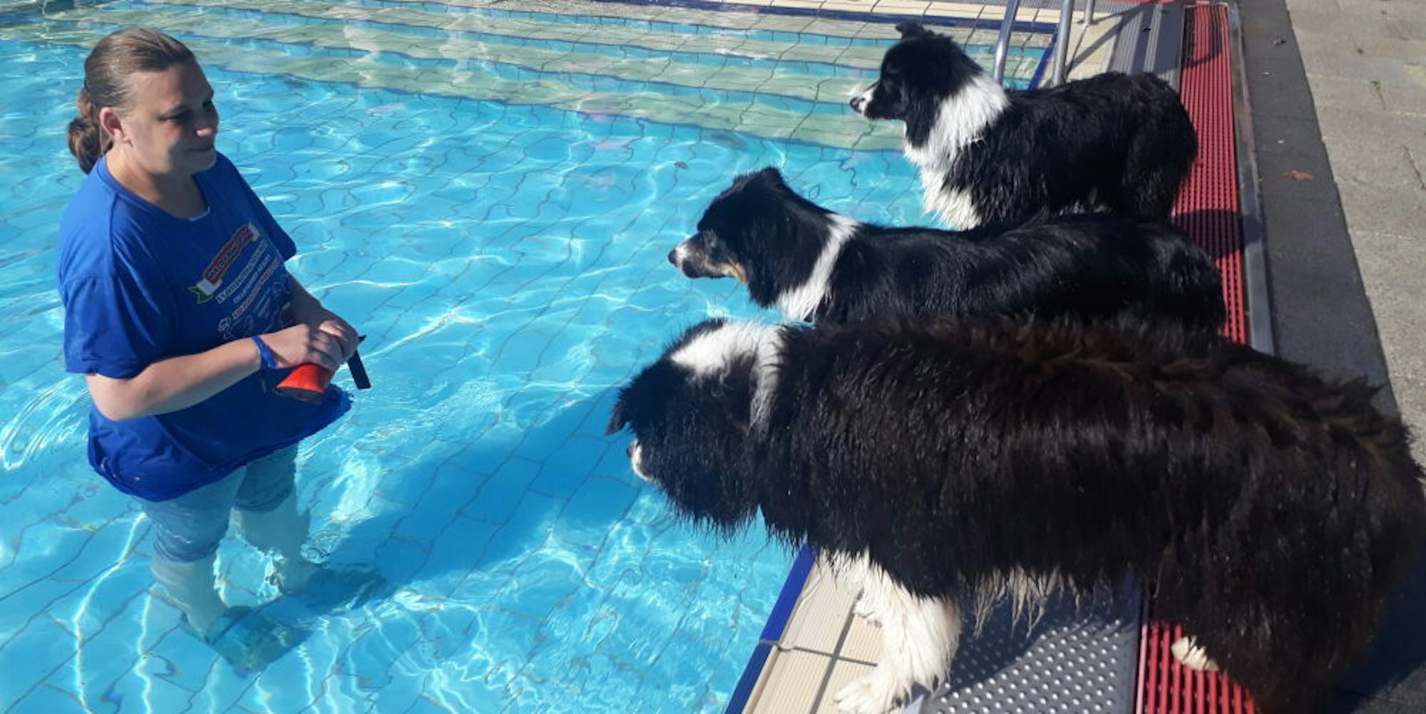 Aus Waldbröl kam Ivonne Schmidt mit ihren drei Border Collies. „Schwimmen macht nicht nur Spaß, ist ja auch gesund . Und das nicht nur für Menschen“, sagt sie. Ihr Border Collie Less hatte einen Rückenmarksinfarkt. „Das Schwimmen tut ihm unendlich gut und hat ihm geholfen, wieder fit zu werden.“ Liane Dorsch aus Mönchengladbach kommt jedes Jahr nach Elsdorf. Sie genießt mit ihrem Terrier-Mix das Wasser und schwimmt mit ihm um die Wette.