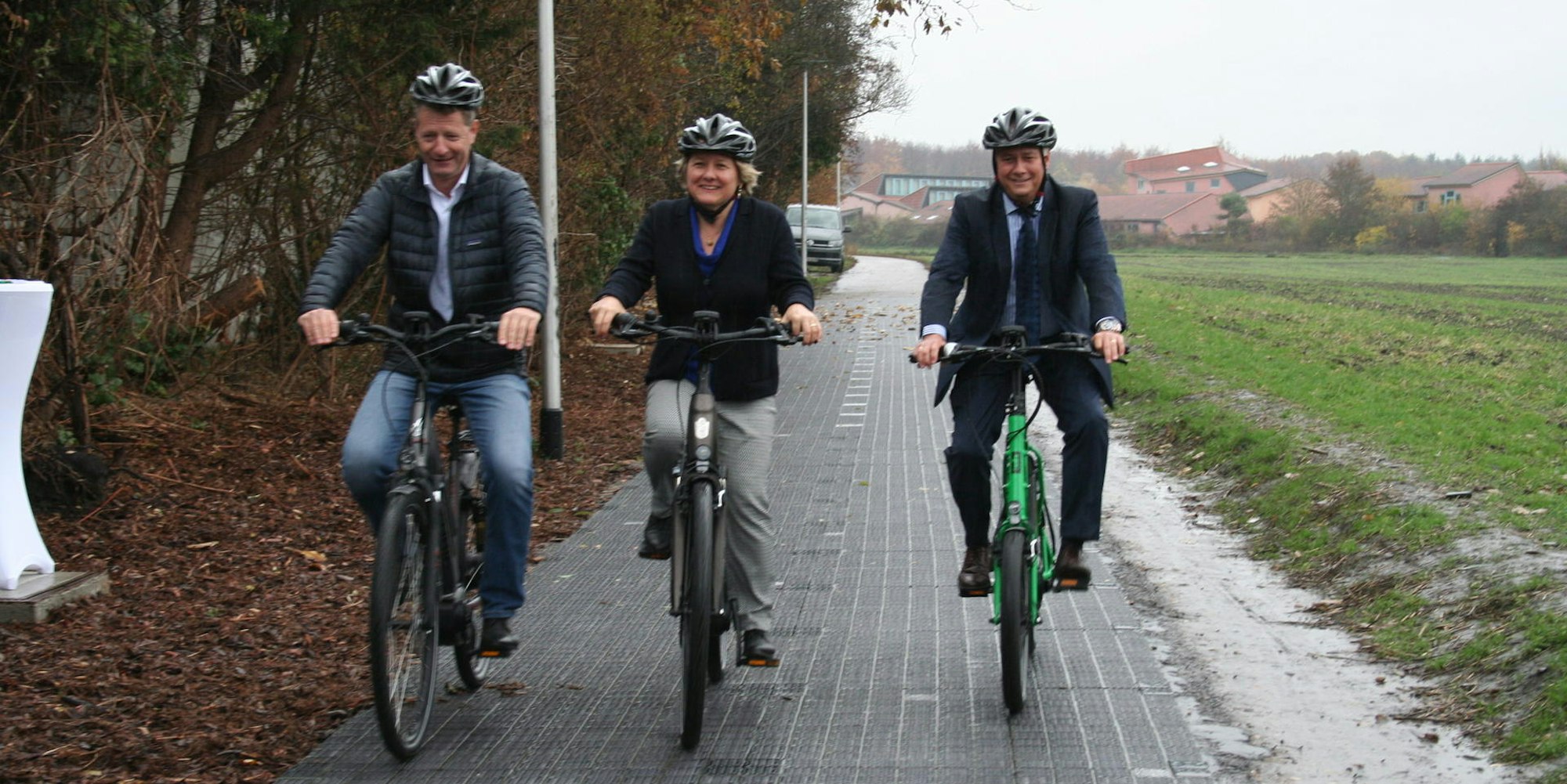 Damals radelten sie noch Seite an Seite optimistisch in eine sonnige Zukunft: Donald Müller-Judex (v. l.), Umweltministerin Svenja Schulze und Bürgermeister Volker Erner.