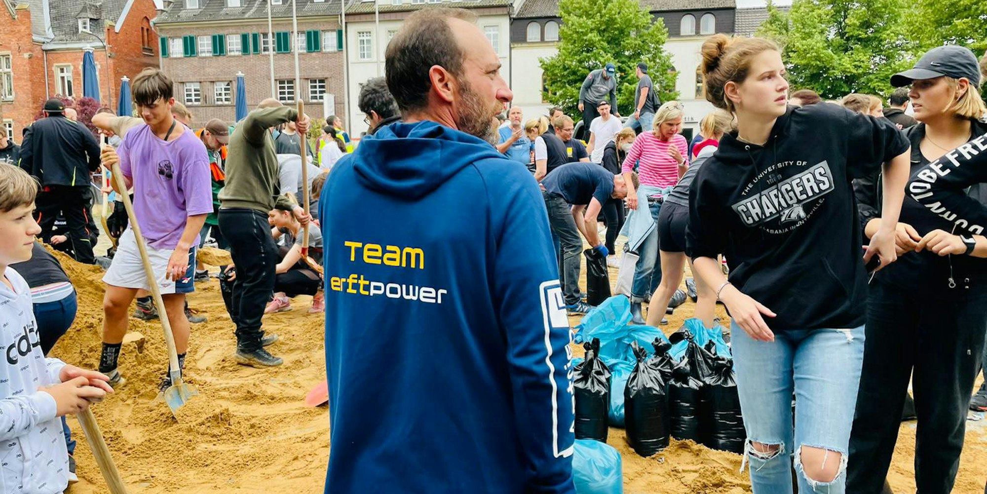 Die Erftstädter Tennisspieler um Teammanager Daniel Merget füllen in Lechenich Sandsäcke.