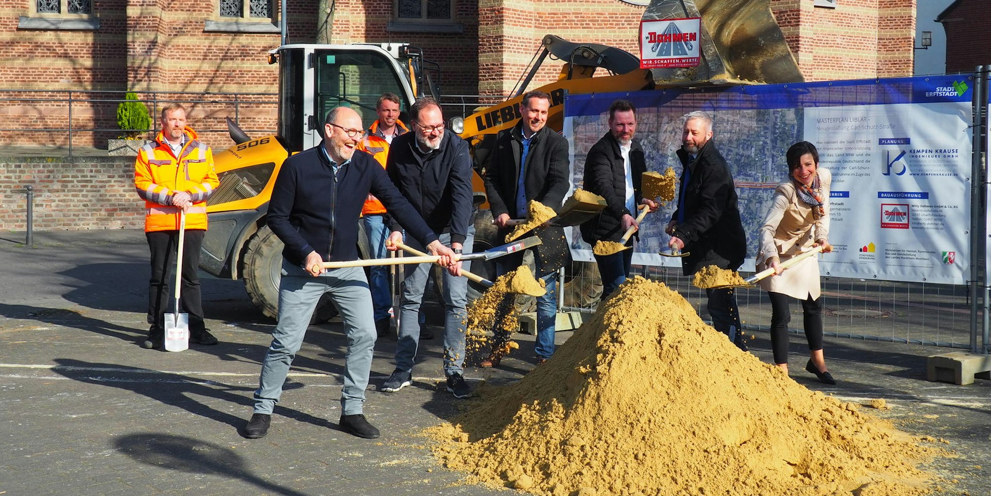 Erftstadt-Liblar – Sie wird ihr Gesicht stark verändern: Die Carl-Schurz-Straße in Liblar soll eine Optik bekommen, die ihrer Bedeutung gerecht wird. Schließlich gebe es an dieser Straße kulturelle Stätten, historische Plätze und bedeutende Häuser, wie Bürgermeisterin Carolin Weitzel sagte. Mit Vertretern des Ingenieurbüros Kempen-Krause (Planung und Bauüberwachung) und der ausführenden Baufirma Willy Dohmen vollzog sie den ersten Spatenstich für das Großprojekt.