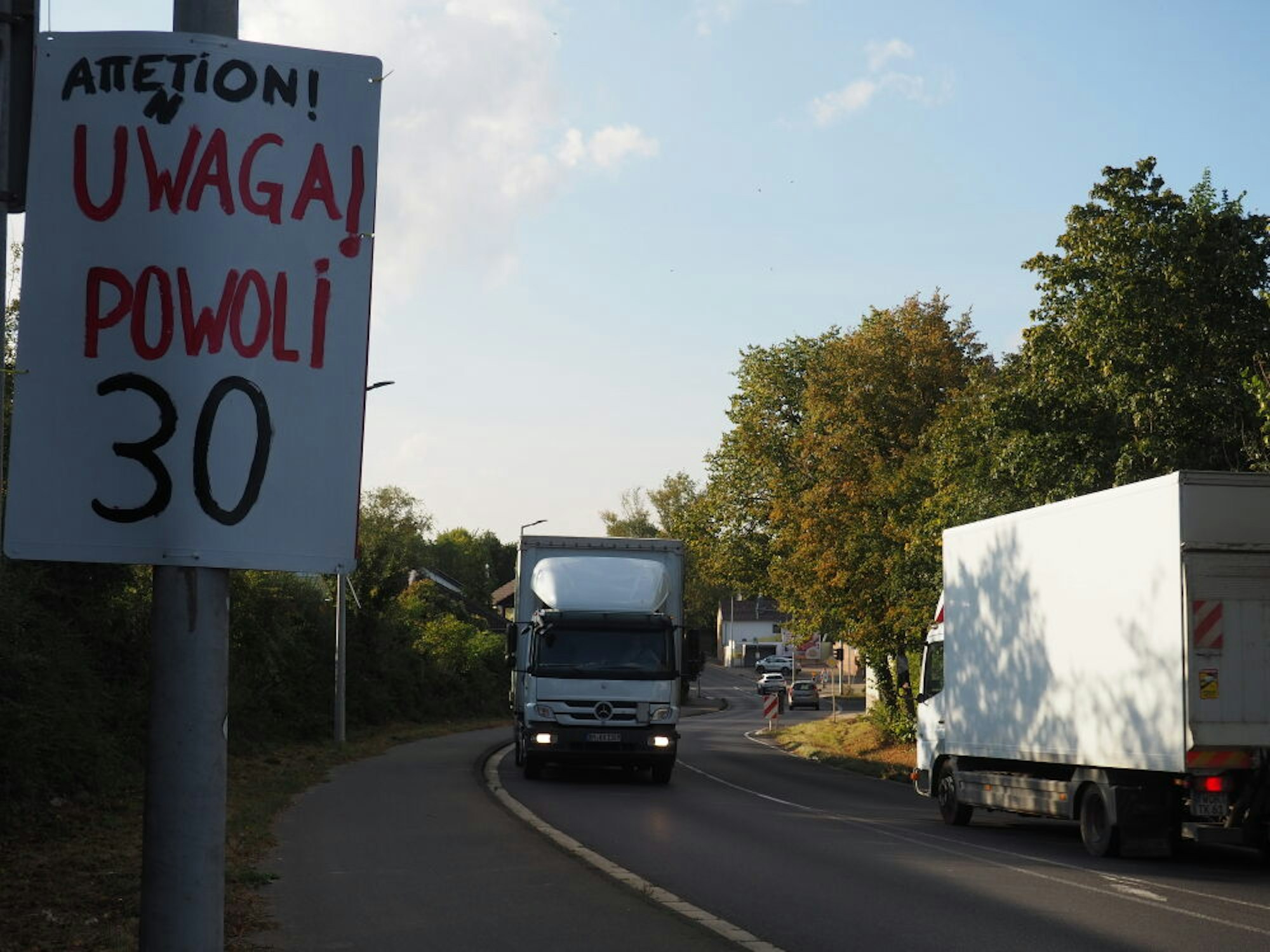Sogar in Fremdsprachen – in diesem Fall Polnisch – bitten die Friesheimer die Lastwagenfahrer auf der derzeit stark belasteten Ortsdurchfahrt, langsam und vorsichtig zu fahren.