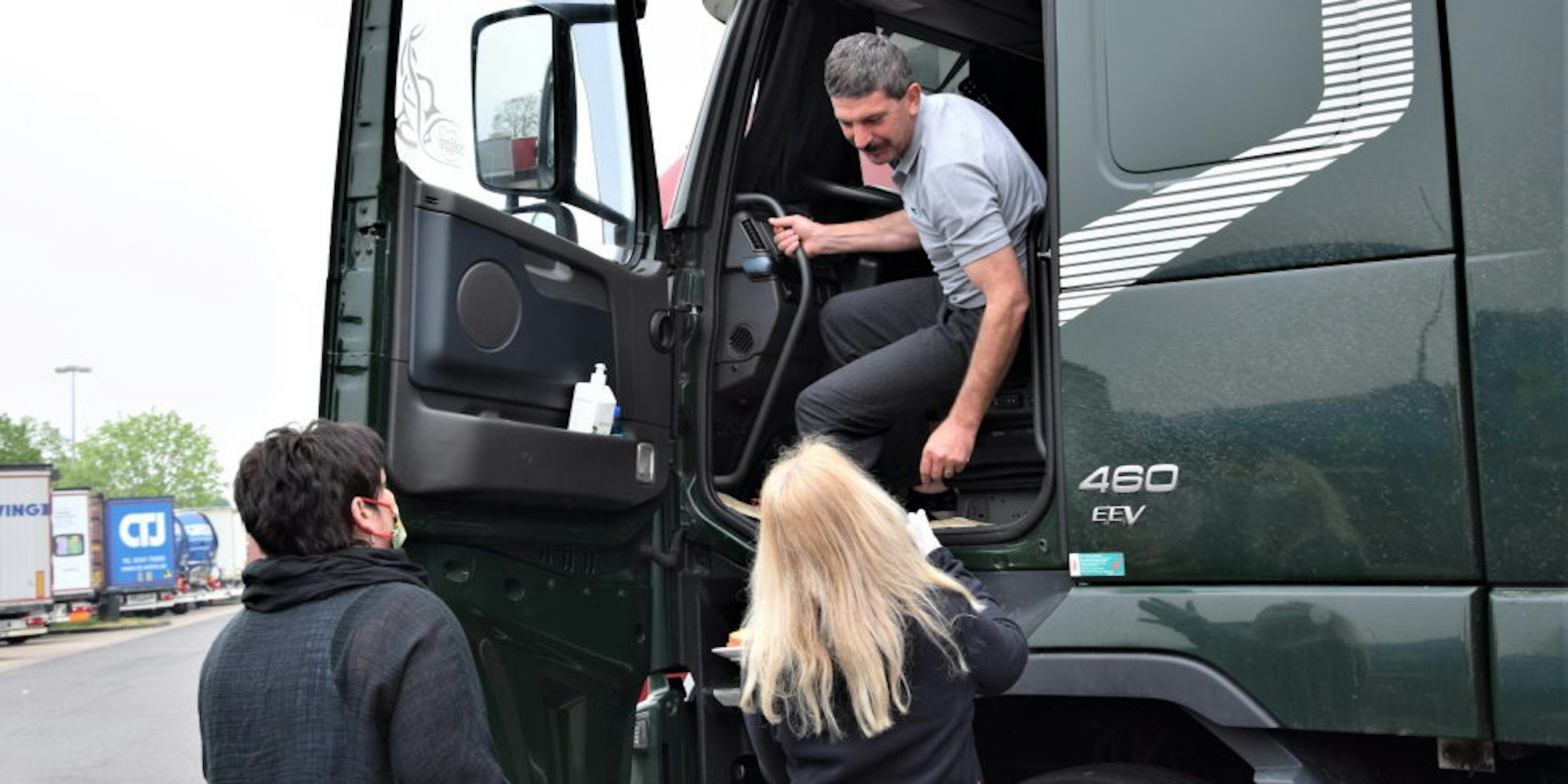 Unterdessen gingen Maja Schmitz und Regina Krusenbaum auf die Fahrerkabinen zu, deren Vorhänge inzwischen aufgezogen waren. „Mein Wagen ist jetzt leer , ich hatte Lebensmittel transportiert und will nun nach Süddeutschland zurück“, erklärte Frank Wagner. „Mit den geöffneten Sanifair-Hygieneräumen geht es ganz gut, und wir haben uns darauf eingestellt, uns selbst zu versorgen, aber das Essen hier ist eine schöne Geste.“