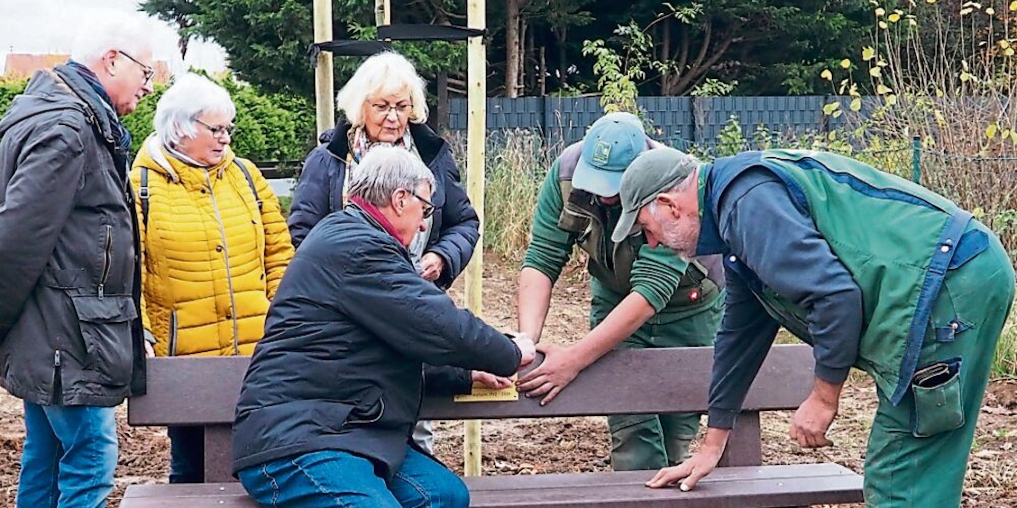 Mit vereinten Kräften wurde die Tafel mit den Spender-Namen an die Bank geschraubt.