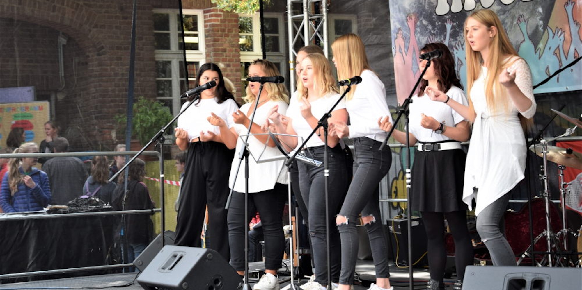 Das Bühnenprogramm läutete dann der Chor der Realschule mit englischen Songs ein. Es folgten Auftritte der Gruppen „Shotting Hill“ und „Inside Outside“ mit Rock- und Popsongs sowie der Jazz-Formation „Take four“. Volkslieder brachte der Russische Verein zu Gehör. Zu den Höhepunkten zählten auch wieder kurdischer Gesang und tamilische Tänze. Ihre Bewegungskünste präsentierten zudem die „Brave Hearts“.