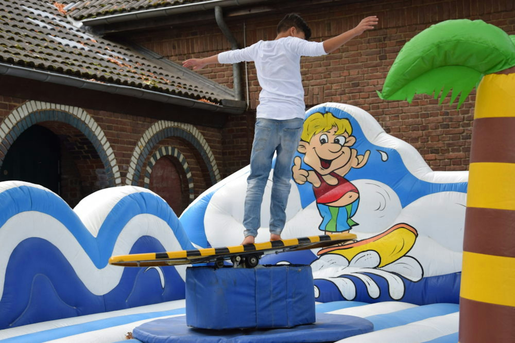 Wer wollte, konnte sich in der Turnhalle bei einem Hindernisparcours austoben. Ganz Mutige wagten sich im Garten auf einen Surfsimulator, andere übten sich im Schleifen und Sägen in der Holzwerkstatt. Offen standen auch die Türen des dort ansässigen TV-Studios 93. Eine Kamera filmte das Bühnengeschehen. Und auf der Speisekarte standen Gerichte aus der Türkei, dem Iran und aus Indien. Auch der zeitweilige Regen trübte nicht die Stimmung. Tische und Stühle waren mit Planen überdacht.