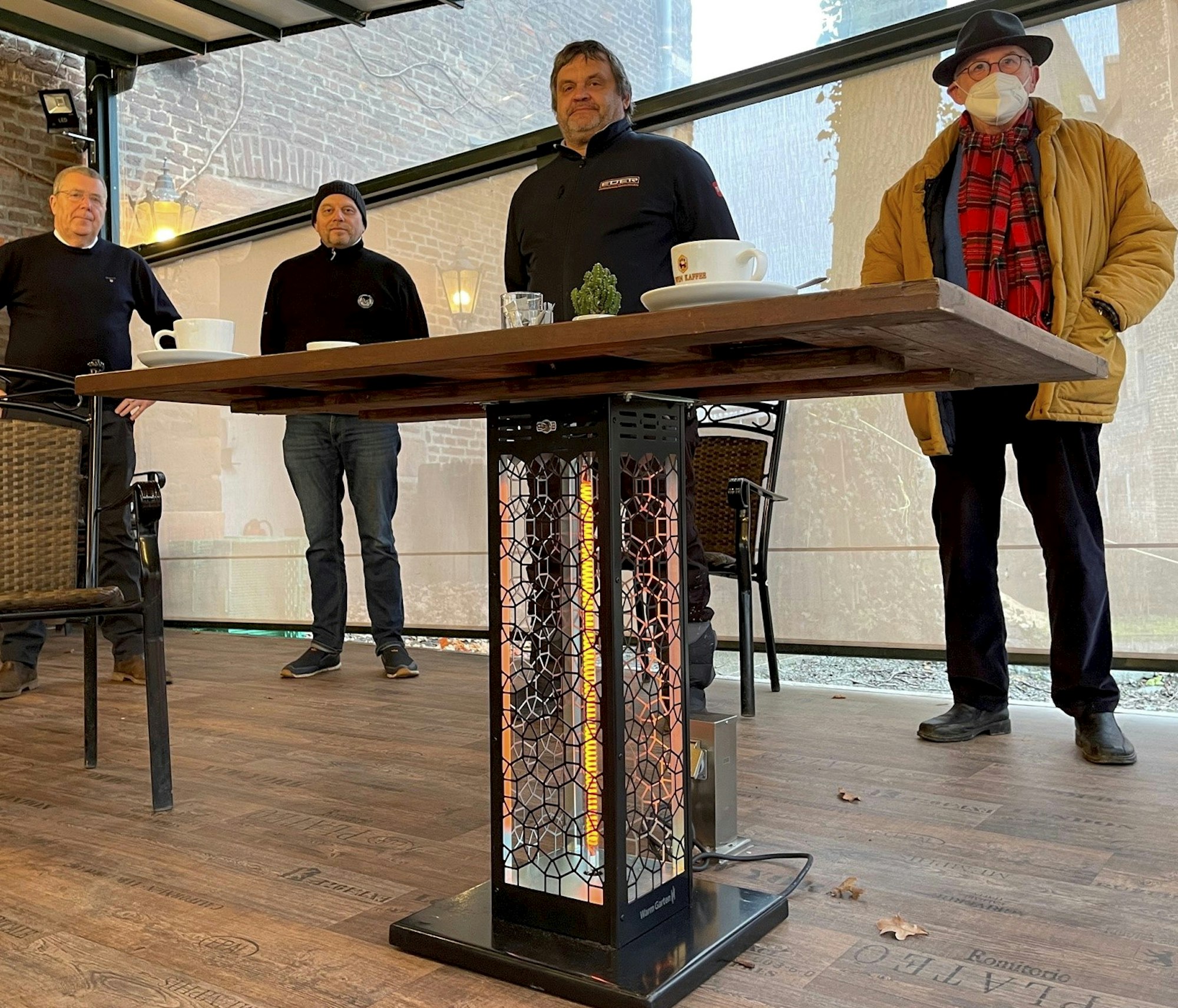 Um einen der Wärmetische auf der Terrasse der Gastronomie stehen (v.l.) Peter Rücker, Sascha Denz, Uwe Mosch und Peter Brügger.