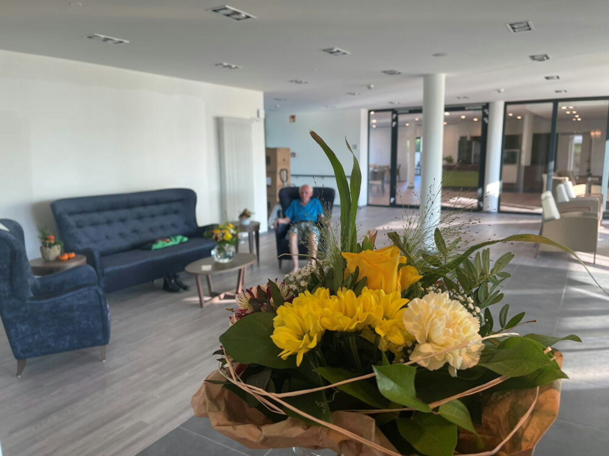 Sie ist Einrichtungsleiterin und bringt als vormalige Leiterin eines Hauses der Arbeiterwohlfahrt im benachbarten Kreis Düren langjährige Berufserfahrung mit. Der Neubau wird durch einen großen und hellen Empfangsbereich betreten, Sitzgruppen laden zum Verweilen ein.