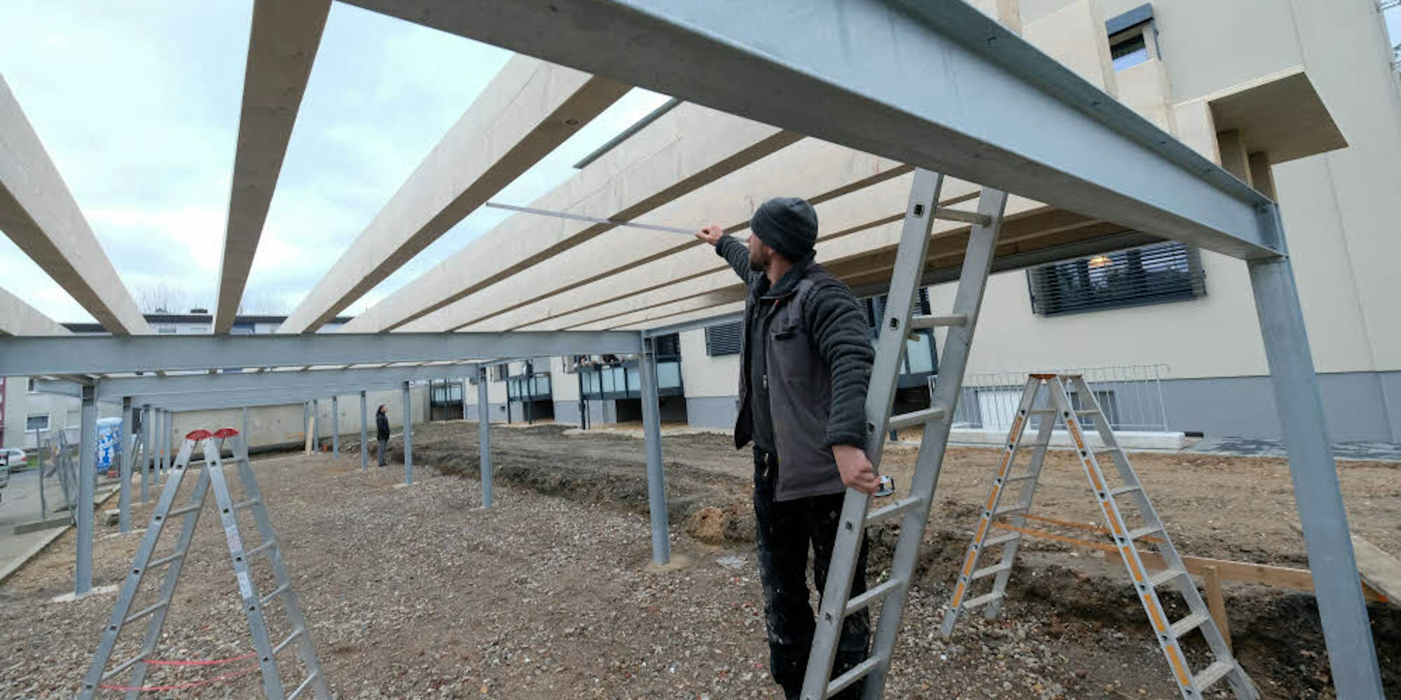 Ein Mitarbeiter der Lechenicher Zimmerei Schendel nimmt Maß an der Dachkonstruktion für die neuen Garagen am Broichweg.