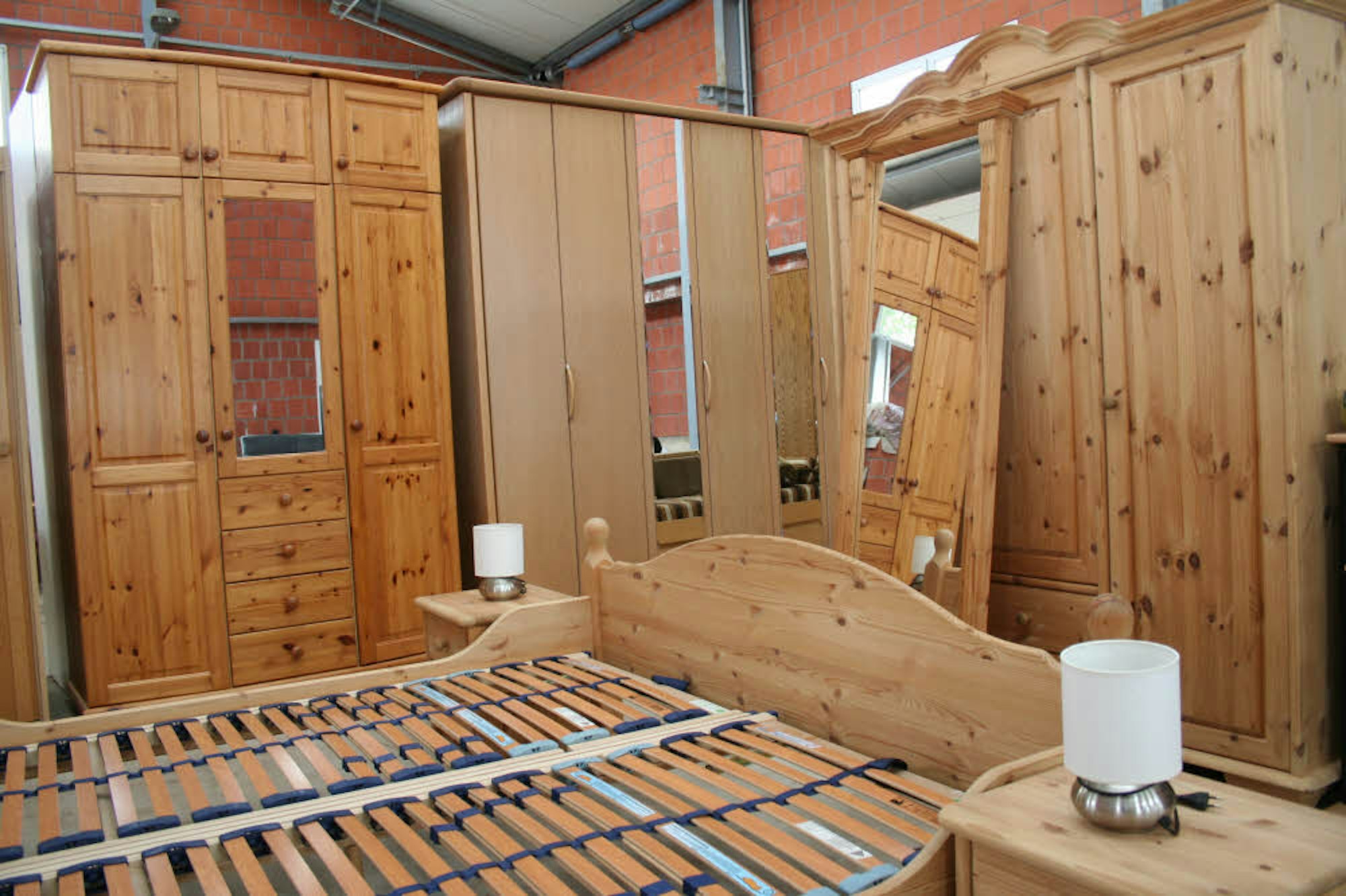 Schränke und Betten warten auf neue Besitzer. Matratzen werden aus hygienischen Gründen nicht verkauft.