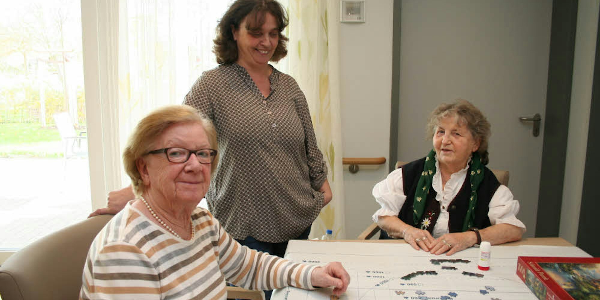 Gertrud Janser (r.) und Marga Kirfel puzzeln gemeinsam, Sandra Werkmeister ermuntert die beiden Seniorinnen.