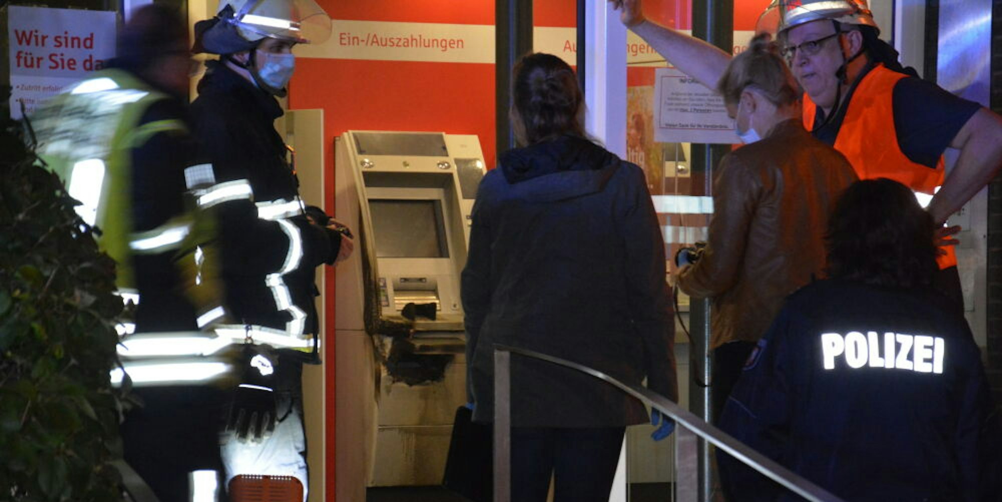 Der Geldautomat brannte bereits, zu einer Explosion kam es aber nicht. Die Täter flüchteten ohne Beute aus der Filiale an der Bahnhofsstraße.