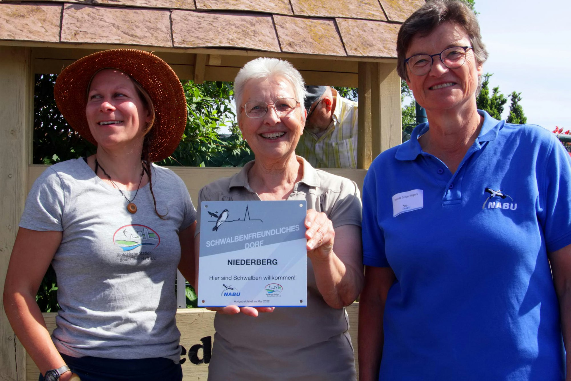 In ganz Nordrhein-Westfalen gebe es erst eine Handvoll Orte, die die vom Naturschutzbund vergebene Auszeichnung „Schwalbenfreundliches Dorf“ erhalten hätten, ergänzt Kreisvorsitzende Désirée Dreyer-Rogers. Schon länger gebe es die Plakette „Schwalbenfreundliches Haus“, und auch diese Tafel sei in Niederberg an erfreulich vielen Toren und Türen zu finden. Das sei auch gut so, betont der Nabu-Vogelfachmann Jochen Hiller: „Die Rauchschwalbe steht auf der Roten Liste auf der Vorstufe. Die Mehlschwalbe gilt bereits als gefährdet.“