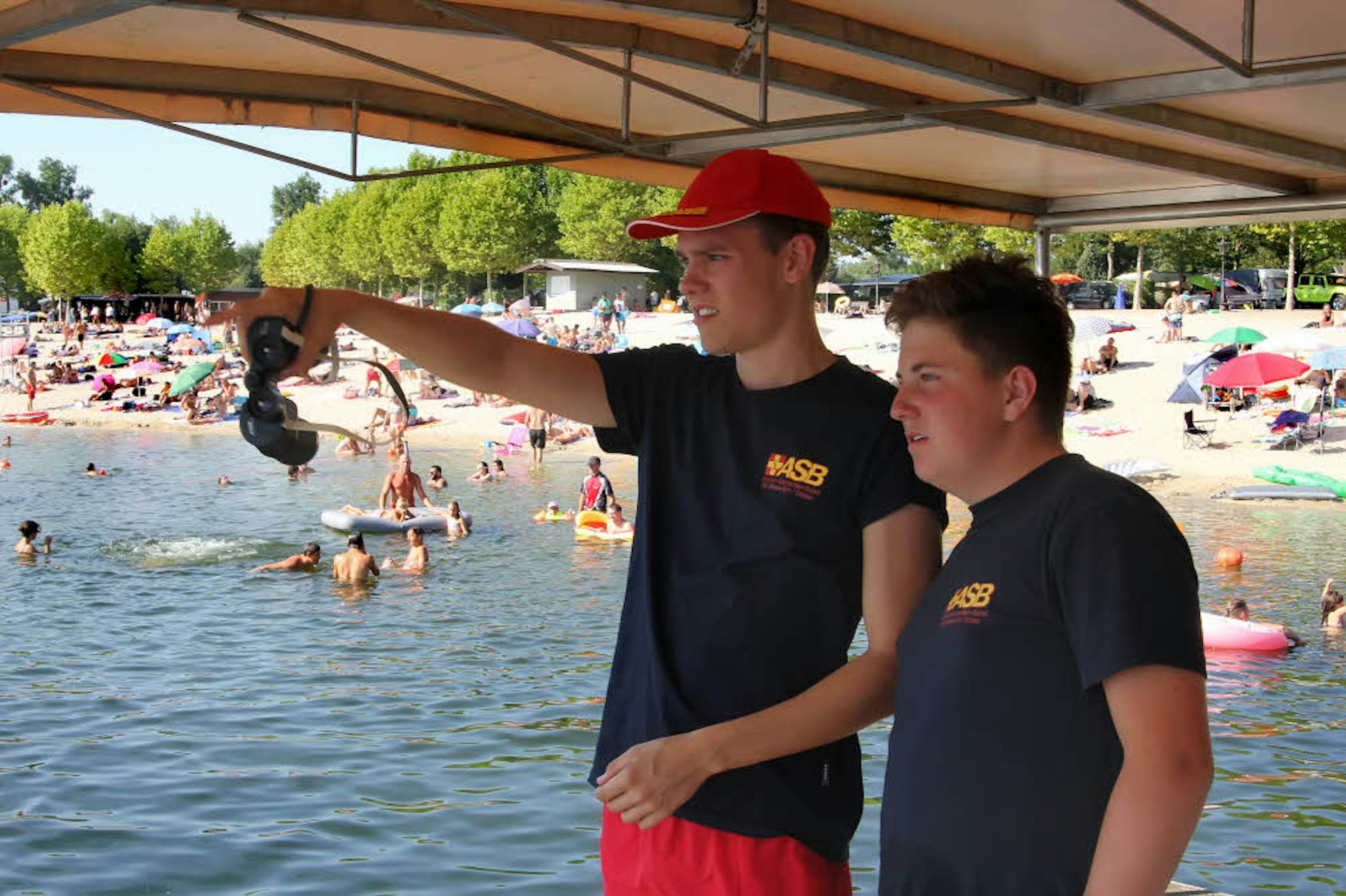 Das ist in diesem Supersommer fast täglich der Fall. „Wir sind in erster Linie für die durch Leinen eingegrenzten Nichtschwimmer- und Schwimmerbereiche in Ufernähe zuständig. Wir halten aber auch den Bereich jenseits der zweiten Kette, wo die Leute eigentlich auf eigene Gefahr schwimmen, sowie den Sandstrand im Blick“, berichtet Jan. Vor allem bei Hochbetrieb ist das kein einfacher Job. An diesem Nachmittag tummeln sich stets rund 250 Badegäste vom Kleinkind bis zum Senior im Wasser, und am Sandstrand brüten noch viel mehr Menschen in der glühend heißen Sonne.