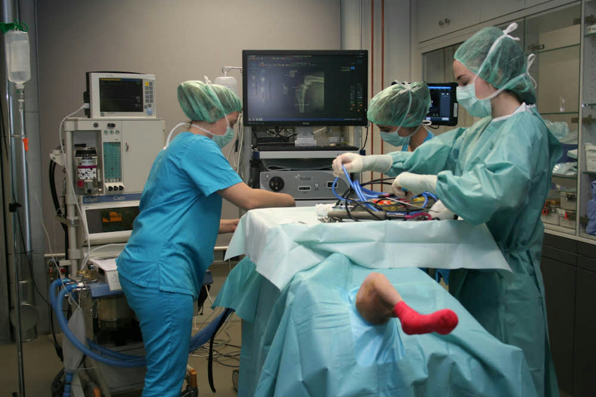 Der Hund ist mit sterilen Tüchern abgedeckt, das Bein rasiert und desinfiziert. Jetzt legen die Helferinnen alles für die bevorstehende Operation bereit. Auf dem Bildschirm sieht man die Röntgenaufnahmen des Gelenks, um das es geht.