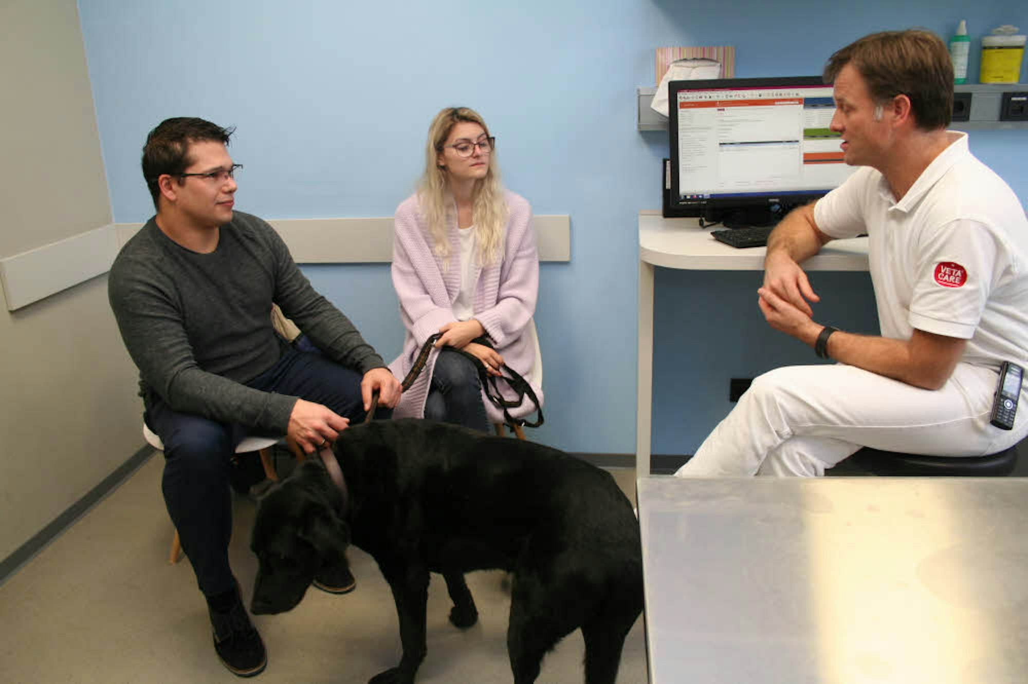 Intensive Gespräche mit den Hundebesitzern gehören ebenso zum Tagesgeschäft wie die Operationen. Christina Busch schaut, wie gut die Wunde am Bein von Fedor verheilt ist. Das Fell wächst schon nach.