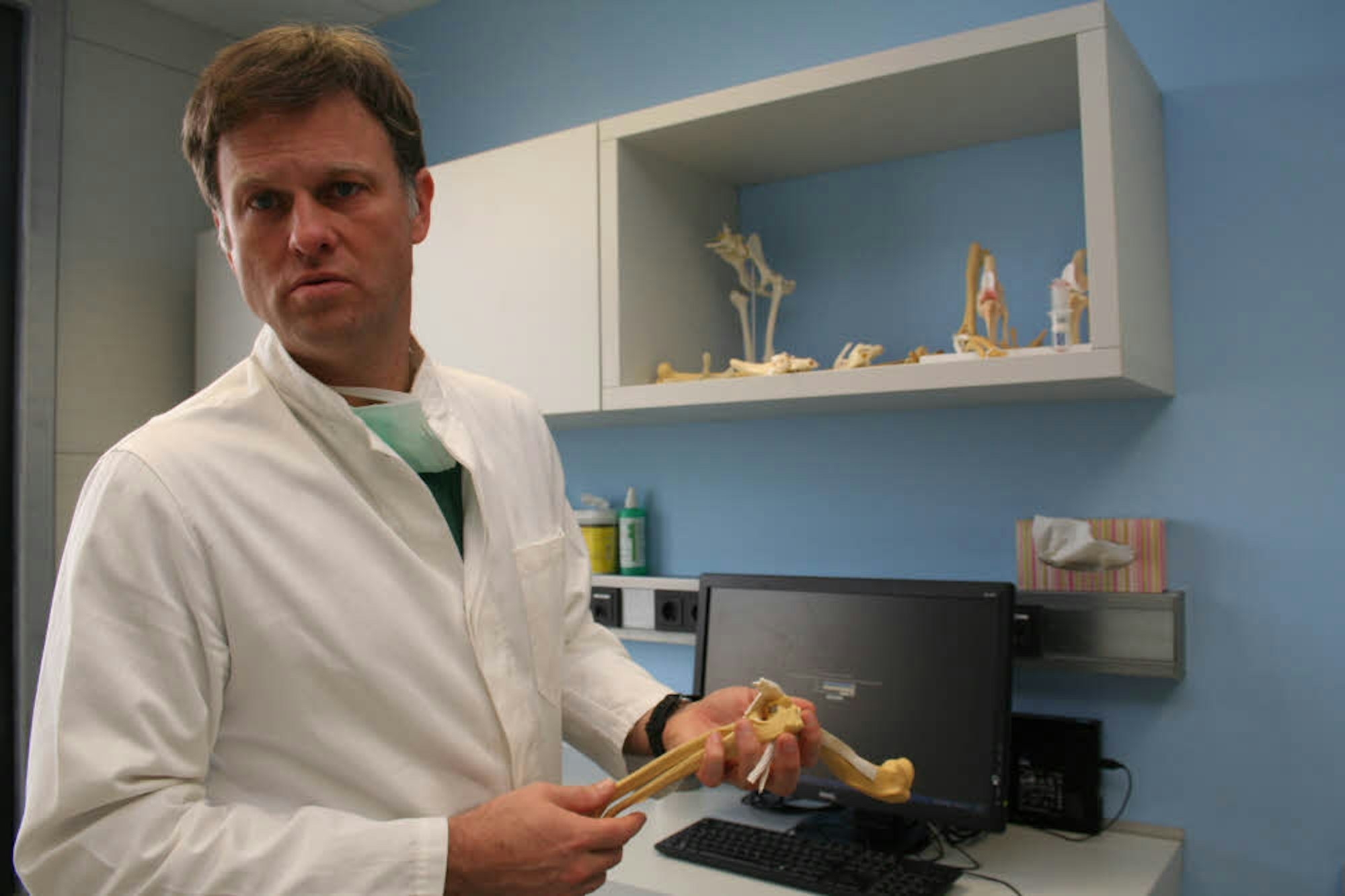 Vorangegangen ist eine Diagnostik, bei der Winkels nicht nur auf moderne Technik setzt. „Das wichtigste Instrument bei der Diagnose sind meine Hände“, sagt er. Die Technik kommt später: Röntgen, Computertomographie (CT), Magnetresonanztomographie (MRT). Damit kann er vieles sehen, aber nicht alles. Gleich beim ersten Patienten macht Winkels eine Arthroskopie des Ellenbogens, führt also ein winziges Kamera-Auge in das Gelenk ein. Der Schnitt dafür ist nur wenige Millimeter lang. Auf dem großen Bildschirm erscheinen rätselhafte weiße Flächen. „Das ist schöner, glatter Knorpel“, erklärt der Mediziner und führt einen Haken durch das winzige Loch ein, um Sehnen zu verschieben, hier zu drücken, dort zu fühlen. Wo es bröckelig aussieht, ist der Knorpel angegriffen, wo es dunkel aussieht, reibt schon Knochen auf Knochen. Ein weißer Fleck entpuppt sich als kleines Knochenstück, das die Bewegungen des Gelenks stört.