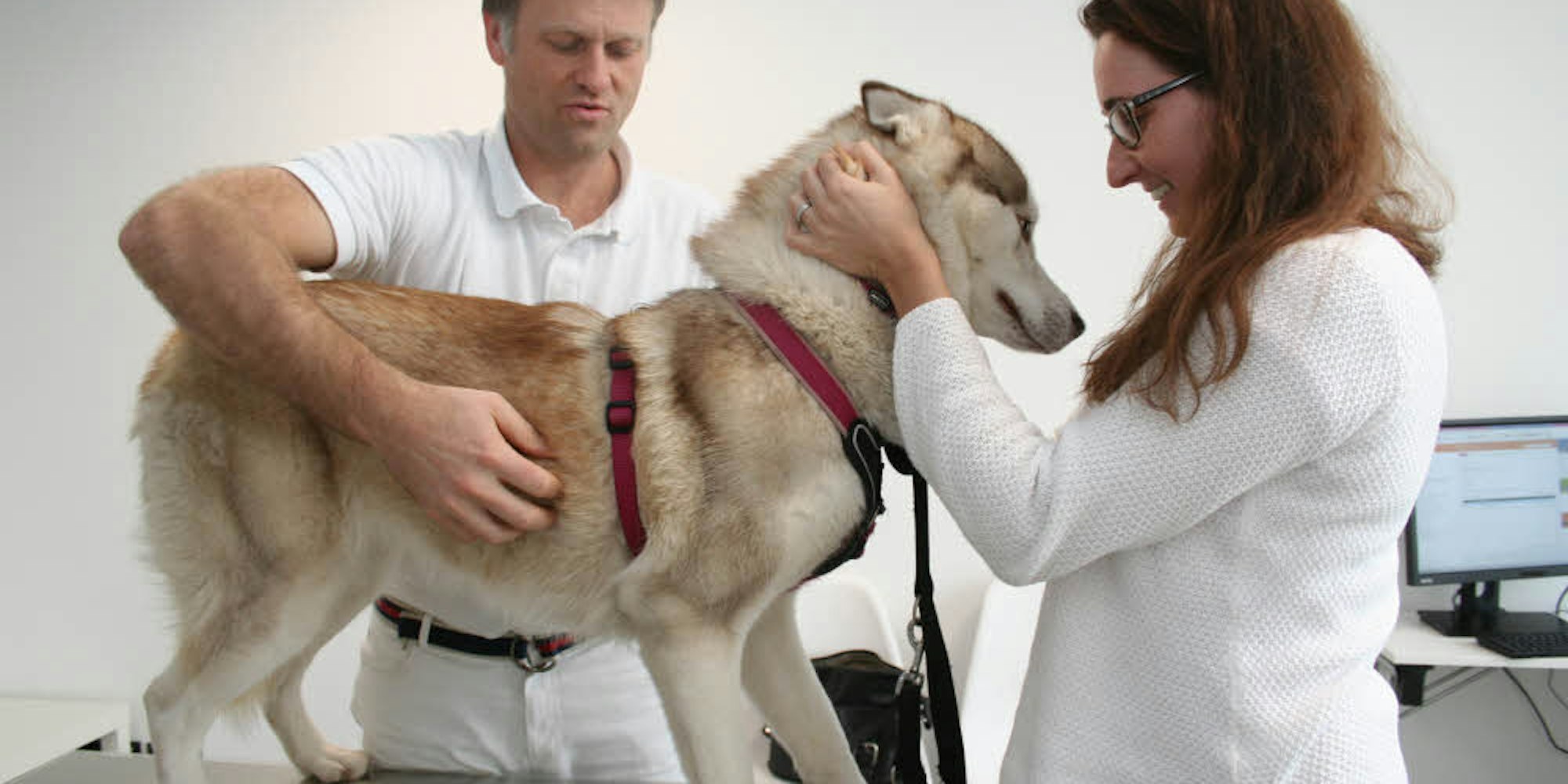 Eine der Hauptursachen für Gelenkprobleme: „Die meisten Hunde sind zu dick“, sagt der Tierarzt. Deshalb führt der erste Weg jedes Patienten zur Waage, die dezent am Empfang in den Boden eingelassen ist. Den Hundehaltern klar zu machen, dass der Vierbeiner abspecken muss, ist allerdings nicht leicht. „Ich bin auf die Mitarbeit der Besitzer angewiesen“, sagt Winkels. Und präsentiert einen Fall, in dem das bestens geklappt hat. Lilly, eine junge Husky-Hündin, ist vor drei Monaten vom Balkon gesprungen und hat sich einen Knochen am Ellenbogen gebrochen. Statt zu operieren, hat der Tierarzt ihr Ruhe verordnet. Und Sandra Barthels hat dafür gesorgt, dass ihre Hündin nicht tollte oder rannte. Das Röntgenbild zeigt: Der Knochen ist verheilt. Und gertenschlank ist Lilly obendrein.