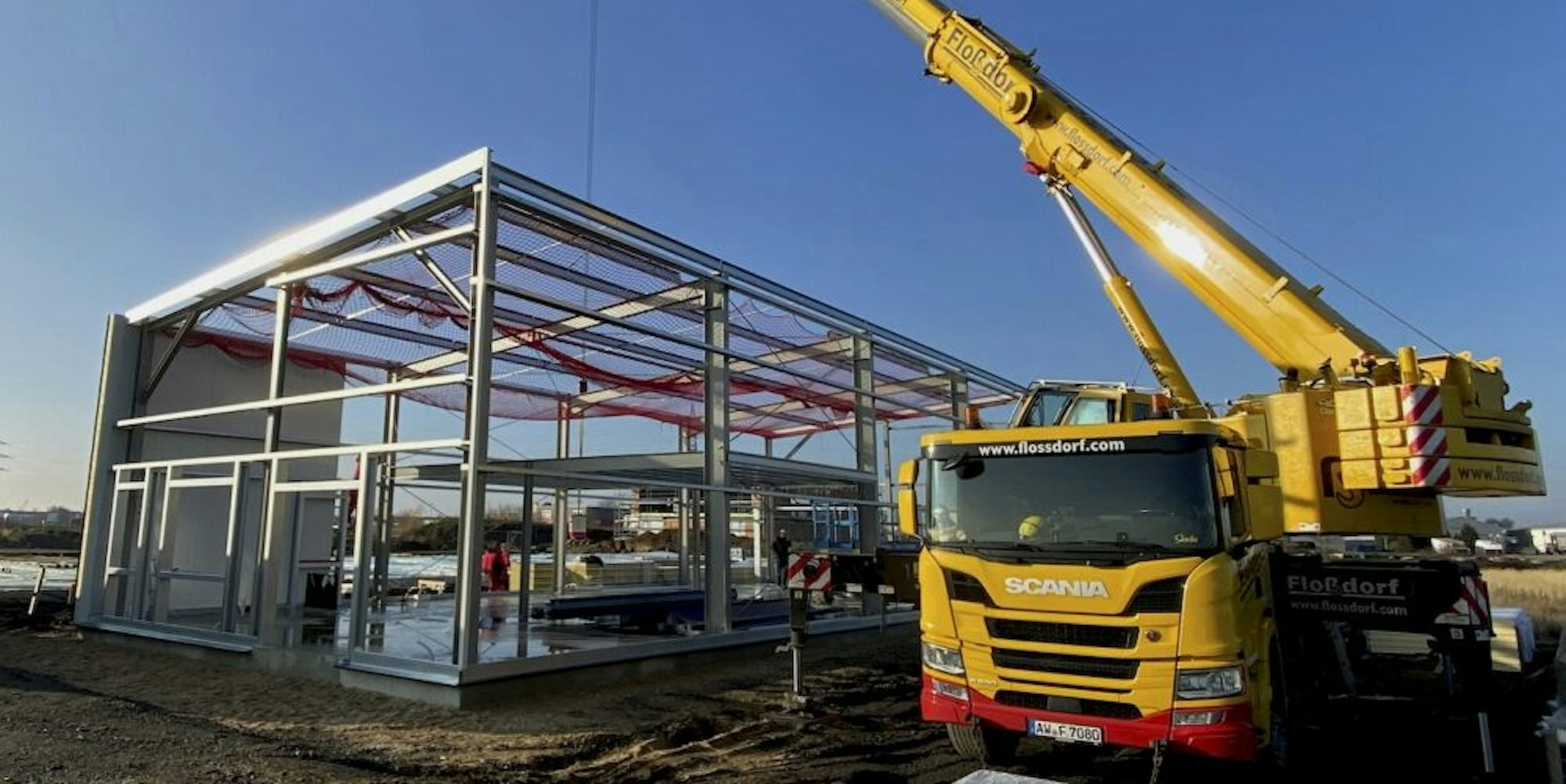 Mit schwerem Gerät wurde die Industriehalle am Albert-Einstein-Ring errichtet. Ein Anbau soll demnächst ebenfalls realisiert werden.
