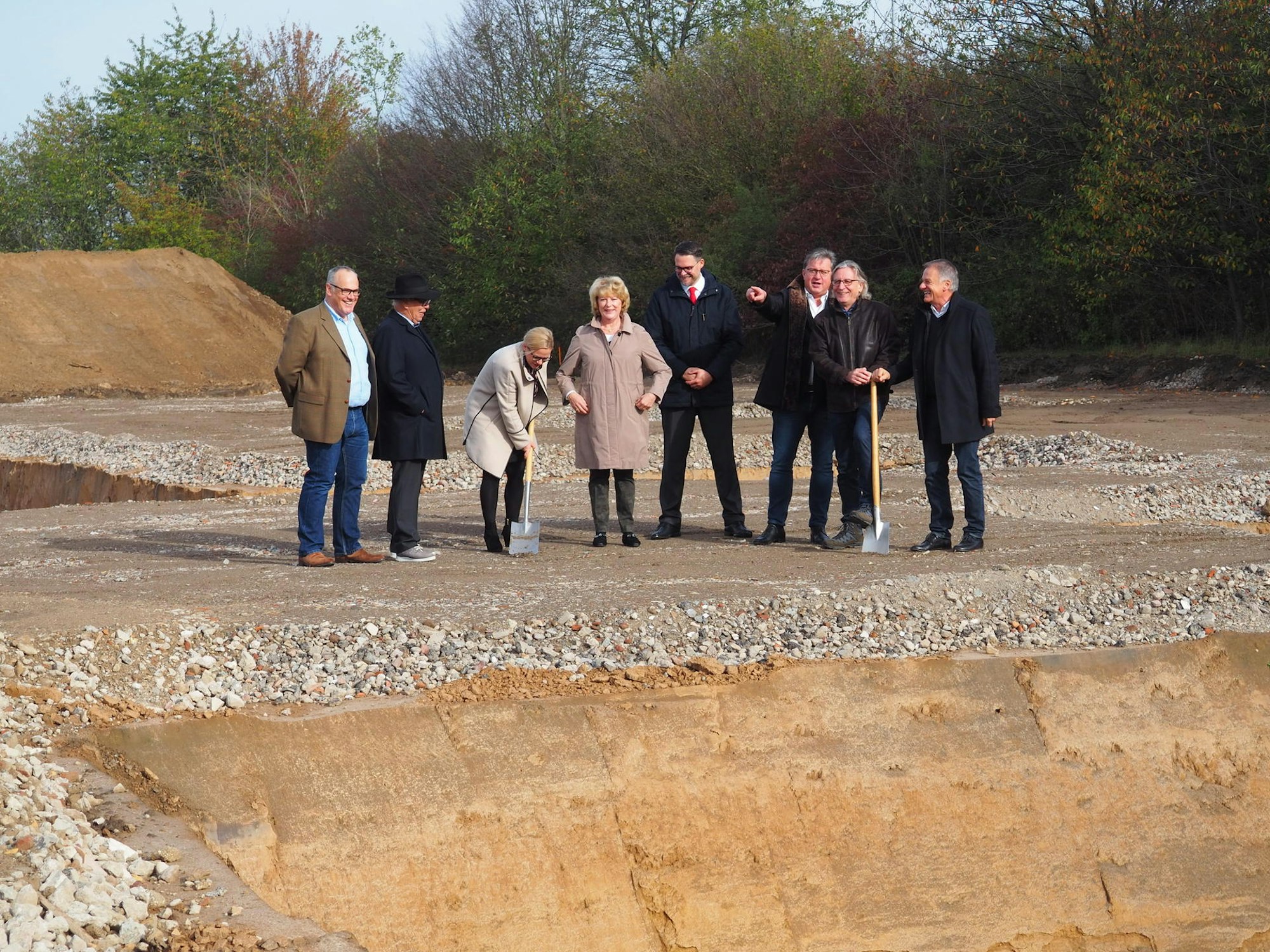 Mit dem Architekten, Vertretern der Bank und der Stadtverwaltung vollzogen die Bauherren den Spatenstich.