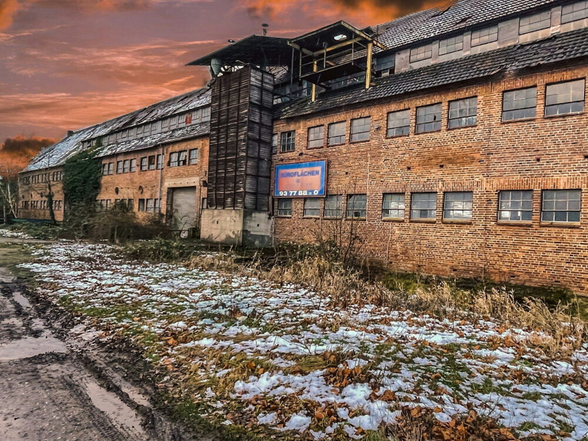 Durch die große Toreinfahrt an der Frenzenstraße fällt der Blick auf das Gelände, wo die Abbrucharbeiten in vollem Gang sind.