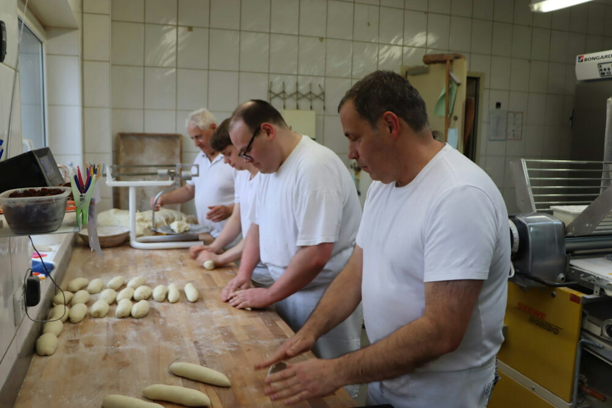 Meister, Gesellen und Auszubildende arbeiten Hand in Hand, wenn aus dem Hefeteig die Martinswecken entstehen.