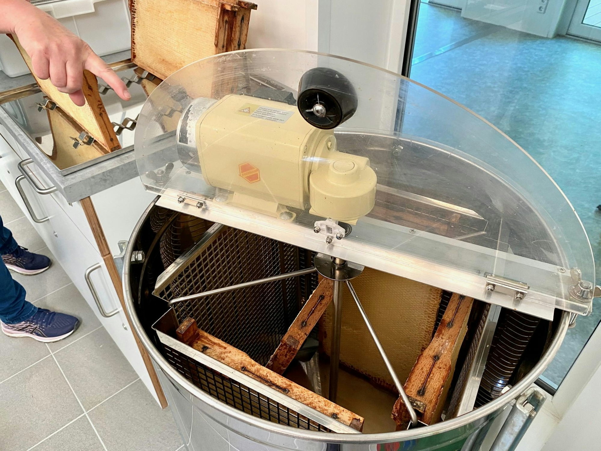 Beim Schleudern in der Trommel wird dann der Honig durch die entstehenden Fliehkräfte aus den Waben gezogen und kann anschließend abgefüllt werden. „Am Ende müssen natürlich alle Geräte wieder gesäubert werden“, sagte Schlömer. Vermittelt wird der Raum über den Imkerverein. Weitere Informationen dazu gibt es im Internet.