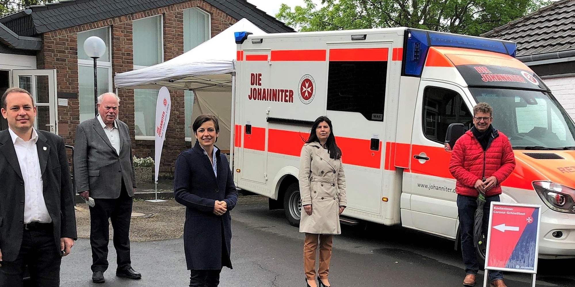 Vor dem Friesheimer Pfarrhaus wurde die mobile Teststation der Johanniter präsentiert.