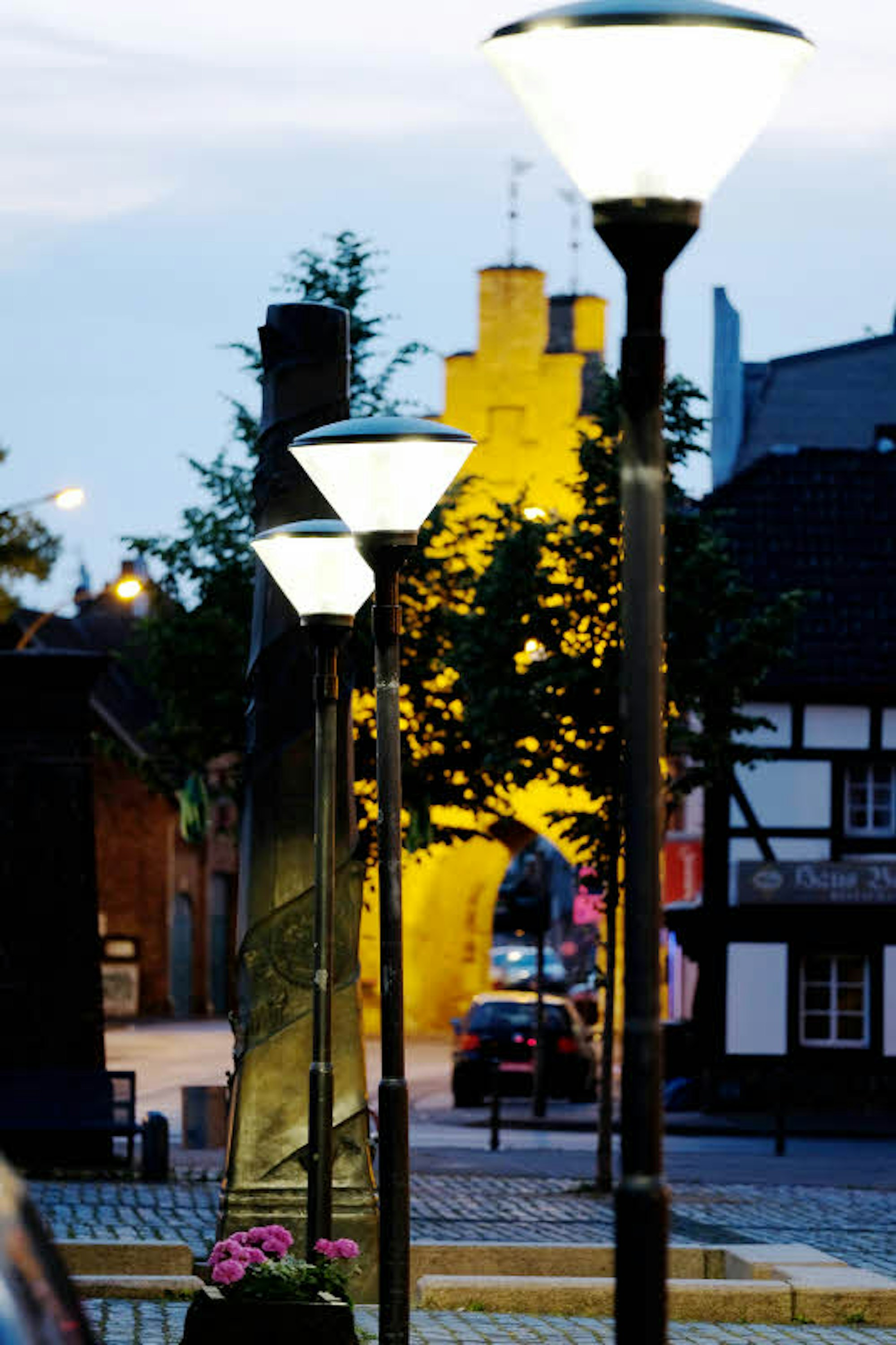 Die neuen Lampen mit LED-Technik sorgen für ein helleres Licht, das sich gleichmäßig verteilt, wie der Blick aufs Rathaus sowie der Geschichtssäule mit Herriger Tor im Hintergrund zeigen.