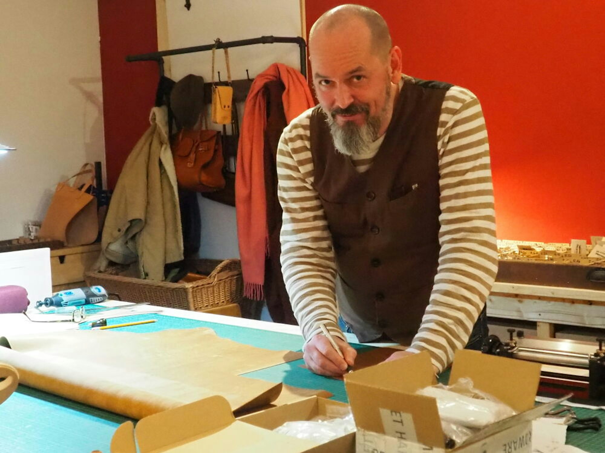 Aber sie hat nicht nur den Tierschutz, sondern auch die Lebensbedingungen der Menschen im Blick. Und kann quasi zu jedem Knäuel etwas erzählen, beispielsweise zu einem flauschigen Produkt in wunderschönem Terrakotta-Ton: „Die wird in Peru von Frauen gesponnen, die mit ihrer Arbeit das ganz Dorf ernähren.“ Nachhaltigkeit und Umweltschutz sind auch Themen für ihren Mann, der die Lederwaren produziert. Die Haut von Rindern und Wasserbüffeln werde in Europa vegetabil gegerbt, also vorwiegend mit pflanzlichen Mitteln und nur ganz wenig Chemie. „Vor allem chromfrei“, sagt Tommy Mewes. Chrom sei ein Umweltkiller. Seine Taschen und Täschchen näht er Stich für Stich von Hand. „Maschinen nähen schnell und gleichmäßig, das sieht langweilig aus und hält nicht.“ Die Nahtlinien zu markieren, mit dem Prickrad die Löcher vorzugeben und mit dem Schlageisen zu vollenden, das sei „keine Raketentechnik“. Er selbst habe keine Ausbildung in Lederverarbeitung, sondern sei Projektmanager.