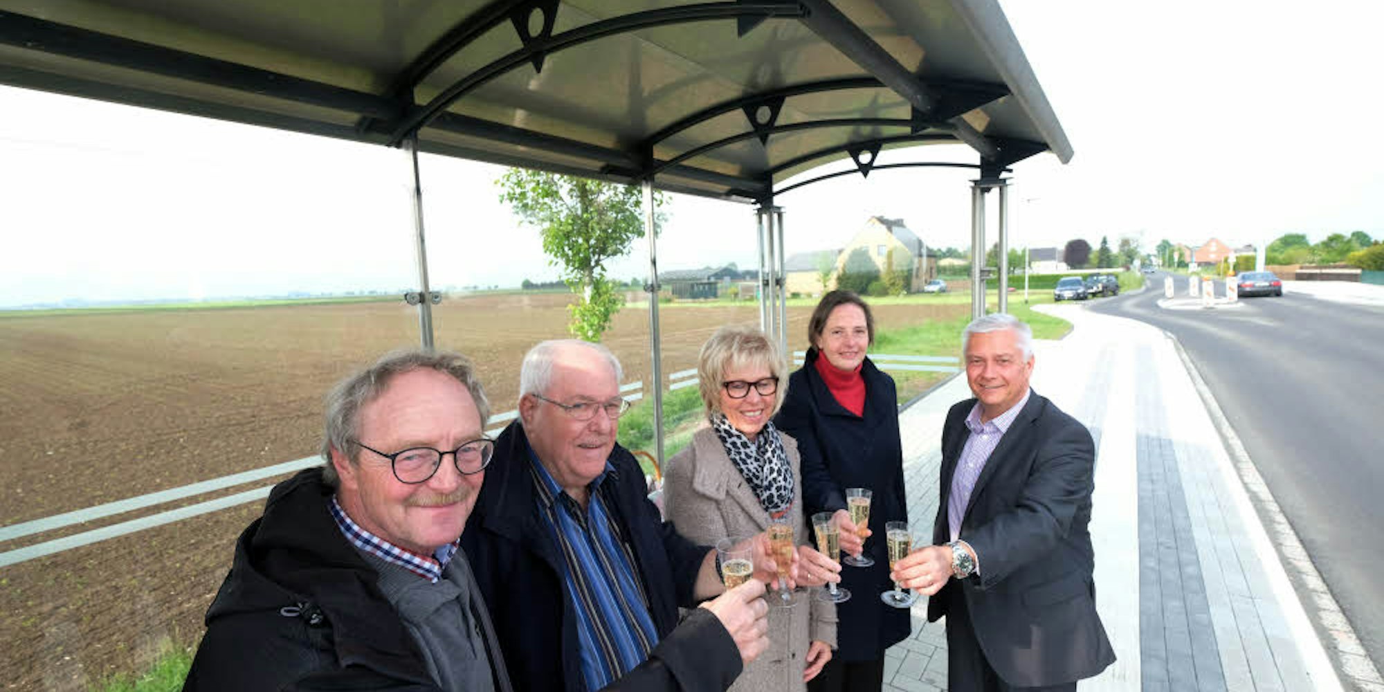 Erftstadt-Herrig – Darauf einen Schampus! Freudige Stimmung herrschte am gestrigen Morgen in Herrig, wo die barrierefrei umgebauten Bushaltestellen am Ortseingang in Höhe der Reyle-Siedlung offiziell ihrer Bestimmung übergeben wurden. Ortsbürgermeister Heinz Mörs stieß aus dem freudigen Anlass mit Bürgermeister Volker Erner, der städtischen Mobilitätsmanagerin Inge Raduner, Planungsamtsleiterin Claudia Seyfried und Walter Keil, zuständig für die Beleuchtung, mit alkoholfreiem Schaumwein an. Mörs erinnerte daran, dass er den entsprechenden Antrag auf Umbau der Haltestellen bereits im Oktober 2016 gestellt habe.