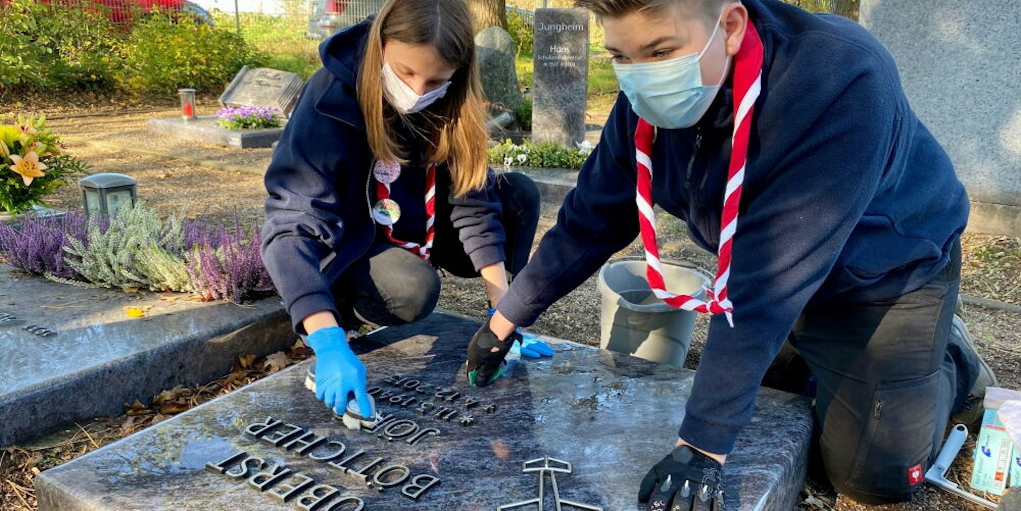 Erftstadt – Vivien Flohr und Alex Rütz, 13 und 14 Jahre alt, rüsteten sich für einen besonderen Einsatz. Sie trafen sich an der St.-Servatius-Kapelle auf dem Friedhof in Lechenich. Ausgerüstet waren sie mit Eimer, Lappen und Schwämmen sowie Putzmitteln. Außerdem fiel auf, dass sie ein rotes Halstuch mit einem weißen Band sowie jeweils eine blaue Bluse mit dem Erkennungszeichen der Malteser, ein achtspitziges Kreuz, trugen. Als jugendliche Mitglieder der katholischen Hilfsorganisation unterstützten sie an diesem Vormittag ehrenamtlich die Grabpflege.