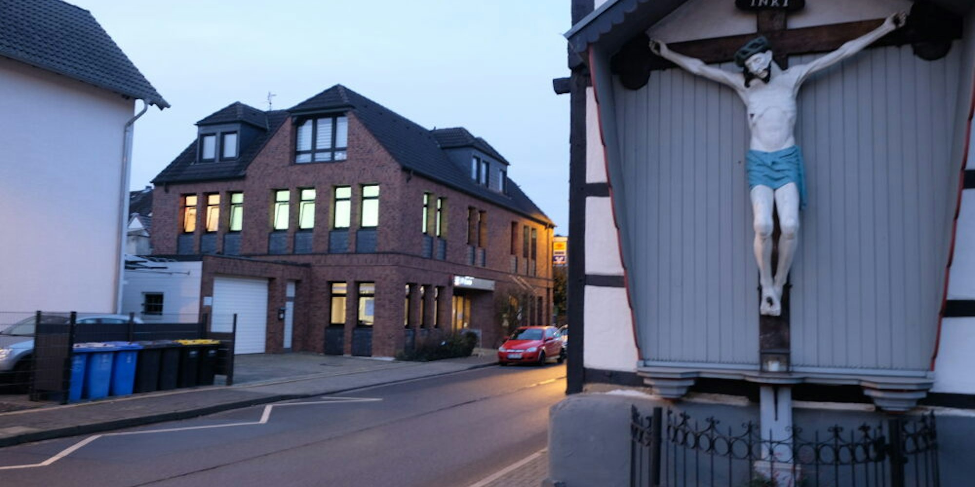 Mitten im Ort unweit der Alten Schmiede mit dem Triumphkreuz befindet sich die Zweigstelle der Volksbank Rhein-Erft.