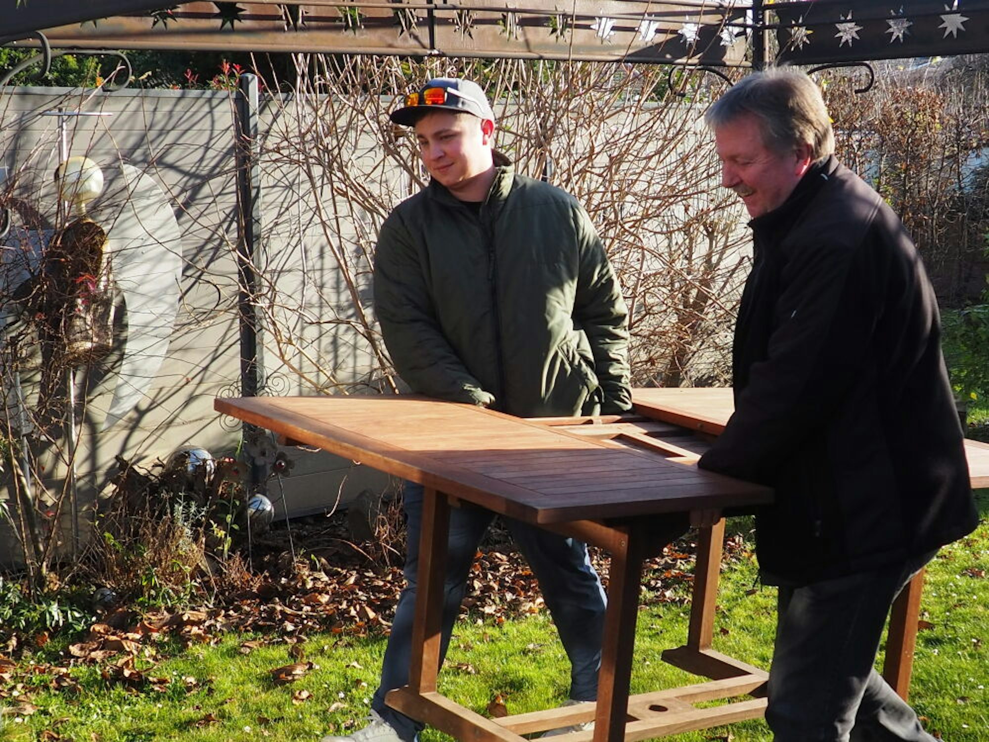 Detlef Künnemann und sein Sohn räumen die letzten Terrassenmöbel ins Gartenhäuschen.