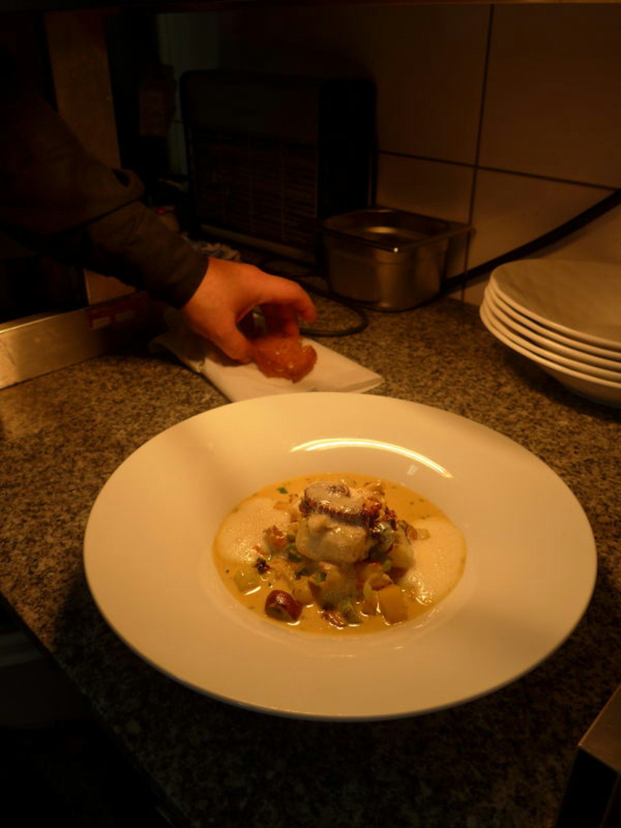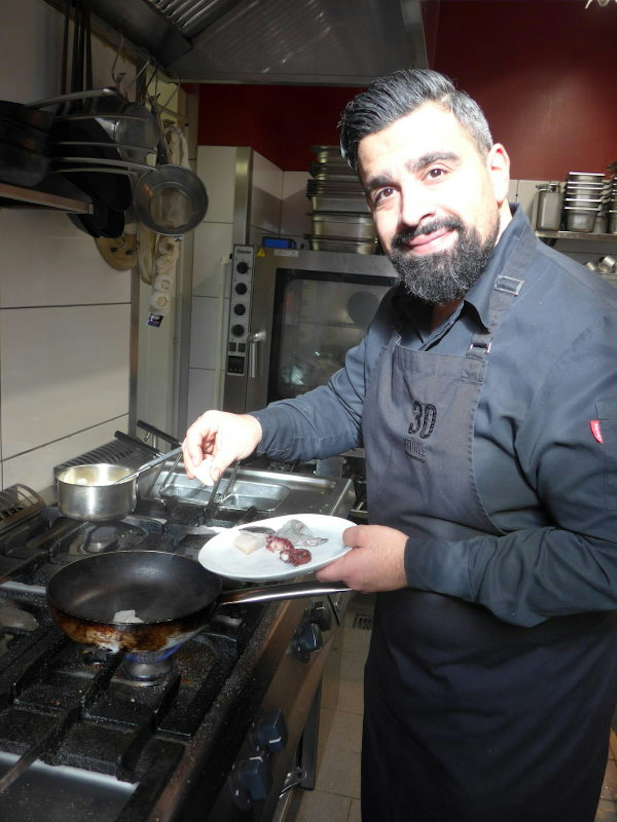 Riccardo Cogliano konzentriert sich mittlerweile ganz auf sein Restaurant 30 Stühle in Wesseling-Keldenich. Sein Brühler Restaurant mit demselben Namen, das er nach dem Umzug nach Wesseling noch für Veranstaltungen nutzte, hat der versierte Koch mittlerweile aufgegeben. Fisch hat in seiner Küche einen hohen Stellenwert. Zu den Klassikern zählt die Bouillabaisse „30 Style“ (9,50 Euro), die Cogliano auf der Basis von Dorade, Gambas und Pulpo interpretiert. Fischfilets und Meeresfrüchte brät der Gastgeber kurz an und gibt anschließend verschiedene Sorten Gemüse und Shiitake hinzu.