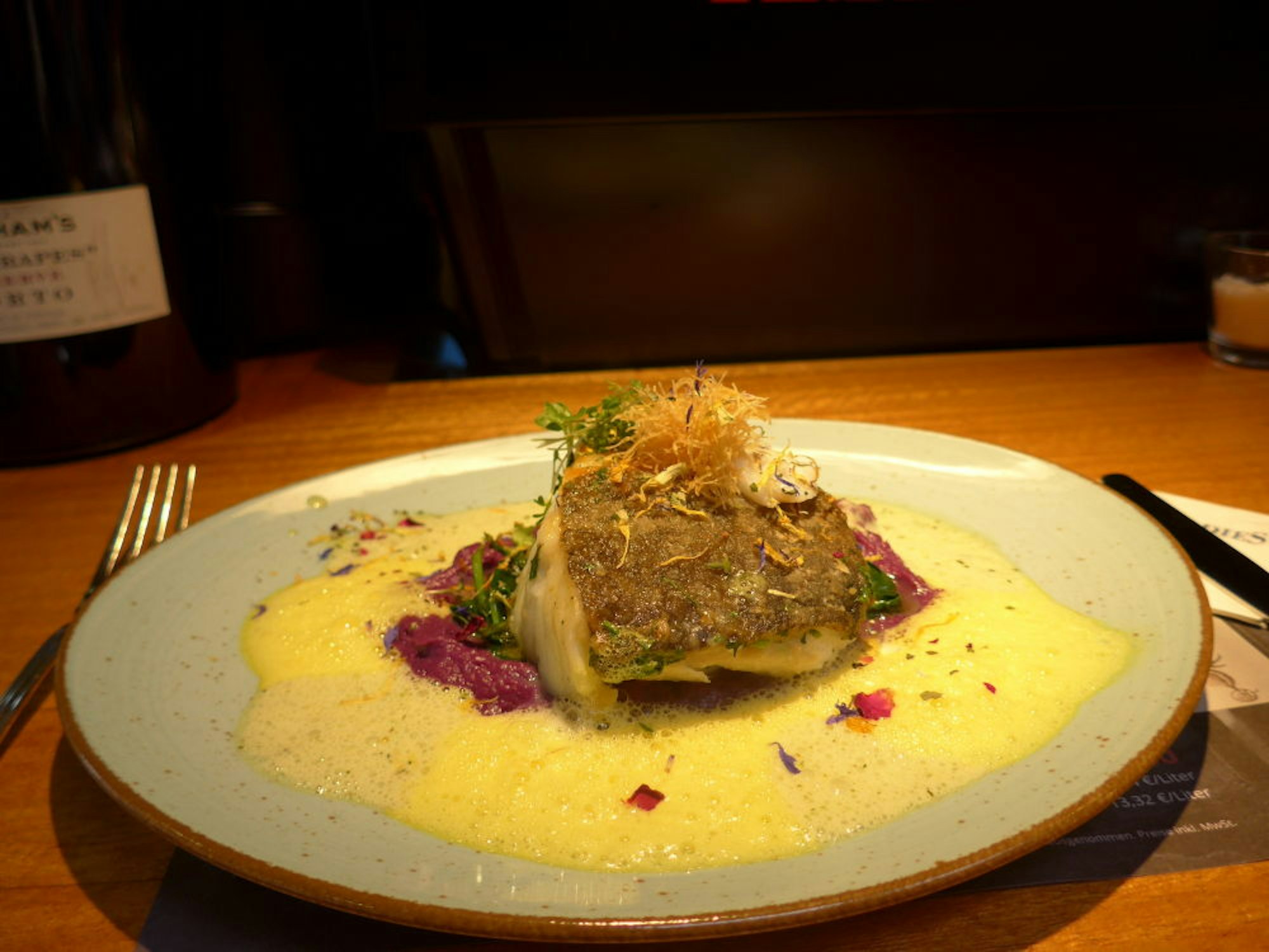 Neben Vorspeisen wie einer Räucherfisch-Variation mit Gurken-Kartoffelsalat und Rote Bete-Meerrettich-Kren (14,90 Euro) oder Kerbel-Kartoffel-Süppchen mit gebratener Jakobsmuschel (9,90 Euro) kommen täglich jeweils zwei Gerichte mit Fisch und Fleisch auf den Teller. Typische Beispiele sind Schwertfischsteak aus Galizien in Zitronenthymianbutter gebraten auf Petersilienwurzelpüree und Grappa-Tomaten oder Fisch-Loin des Tages aus Island mit Safransauce, Fusilli Lunghi und Spinat-Zitronengemüse (je 24,90 Euro).