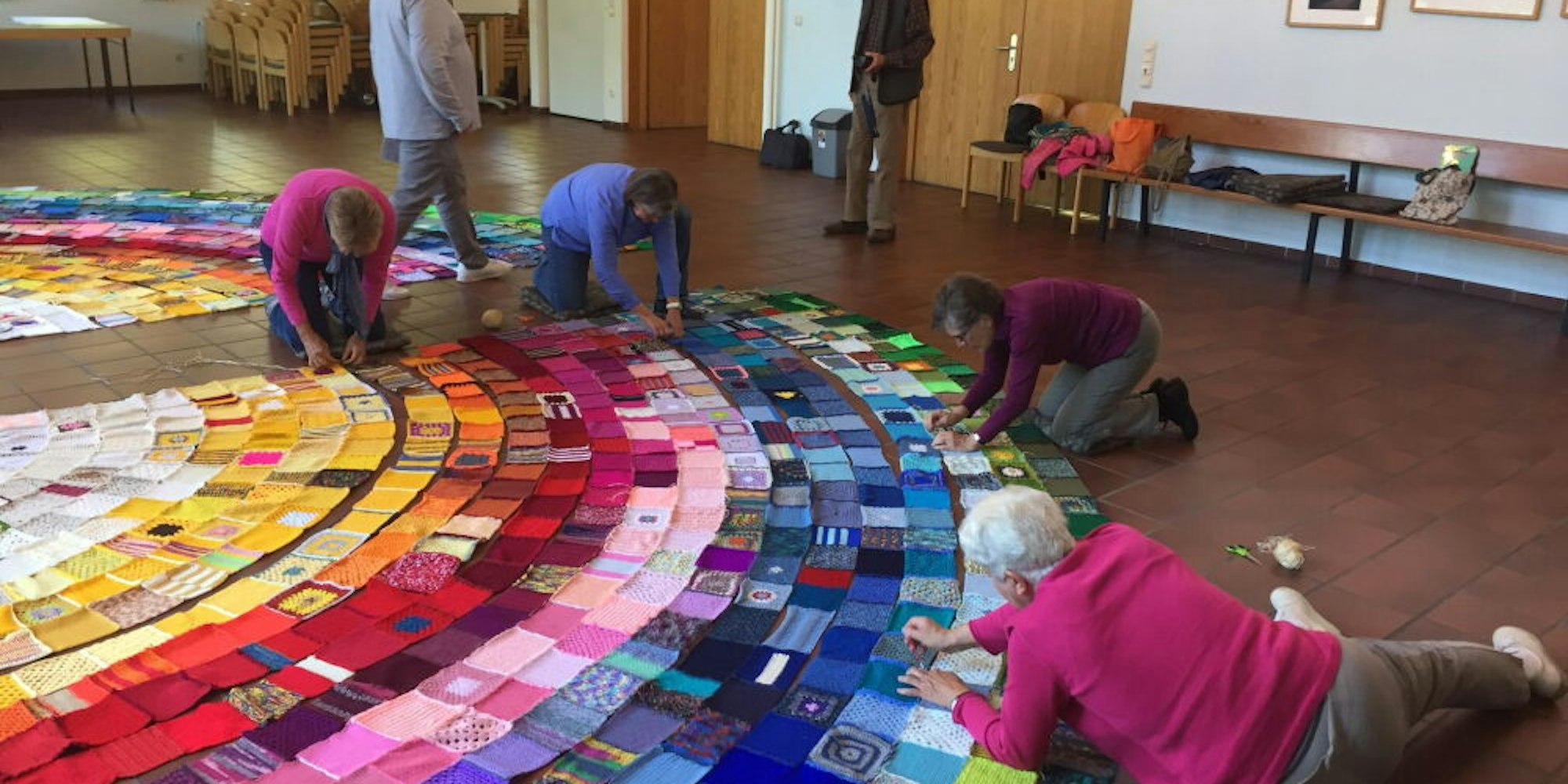 Bereits im vergangenen Winter und im Frühjahr hatten vor allem Frauen aus Königsdorf und Brauweiler die 15 mal 15 Zentimeter großen Wollquadrate gehäkelt oder gestrickt. Im Sommer wurden sie in den Kirchen der Christusgemeinde gesammelt, sortiert, farblich geordnet, in Zeltform ausgelegt und zu Bahnen verbunden. Diese Streifen fügte eine kleine Gruppe von Häklerinnen im Königsdorfer Gemeindehaus an der Pfeilstraße zusammen. Dort wurde das Zelt nun auf der Wiese vor der Kirche aufgebaut und das große Handarbeitswerk an Bambusstangen fixiert.