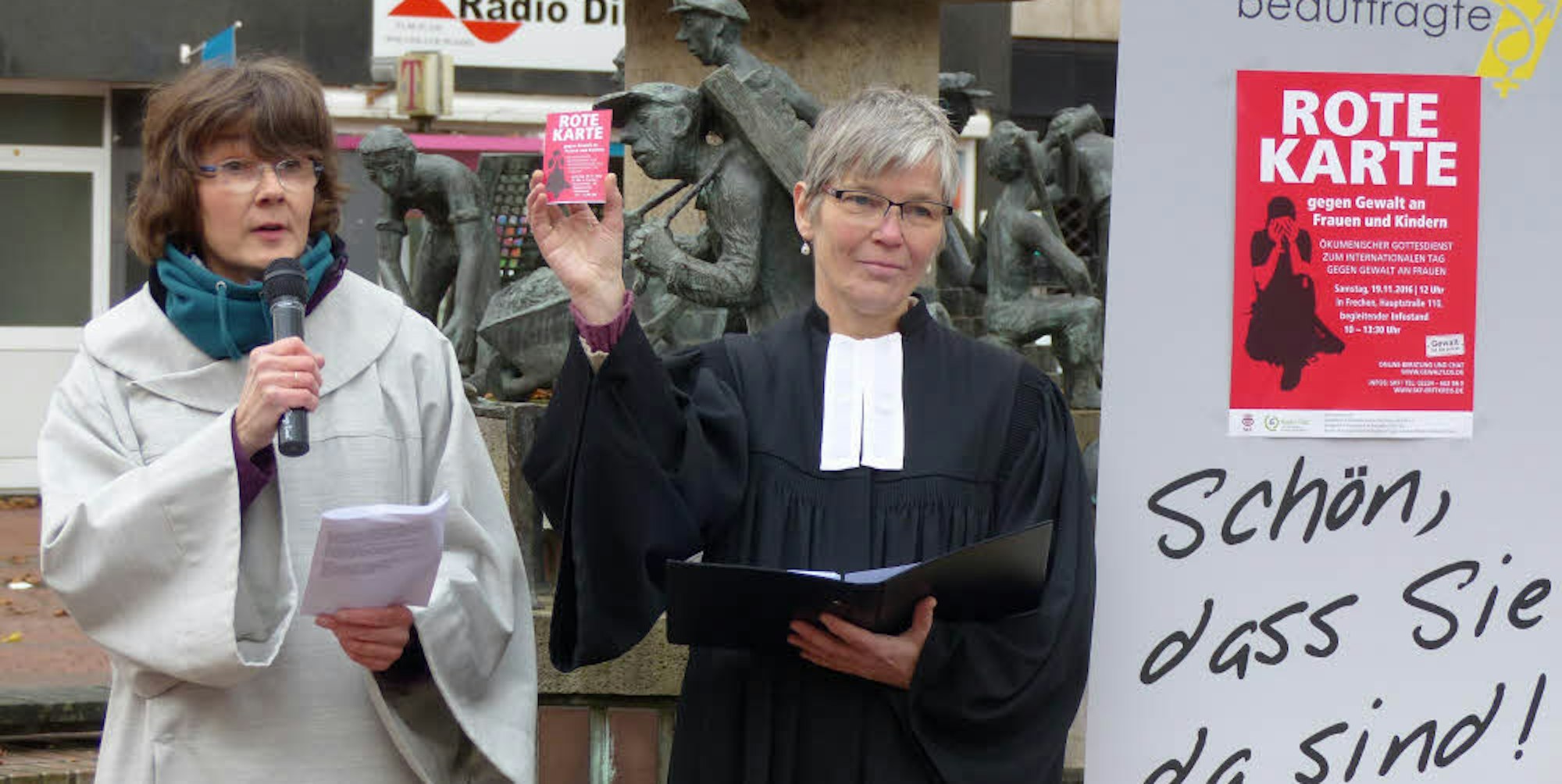 Um 12 Uhr mittags begann am Klüttenbrunnen ein ökumenischer Gottesdienst mit der Referentin des Erzbistums Köln für Ehepastoral im Rhein-Erft-Kreis, Regina Oediger-Spinrath, und der evangelischen Pfarrerin in Frechen und Kerpen, Almuth Koch-Torjuul. Musikalisch kommentierte Barbara Bannasch das „Nein zu Gewalt“ auf Cajon, Blockflöte, Klangschalen, Mundharmonika, mit Steinen, die sie aufs Pflaster warf, und Hammerschlägen auf Holz.